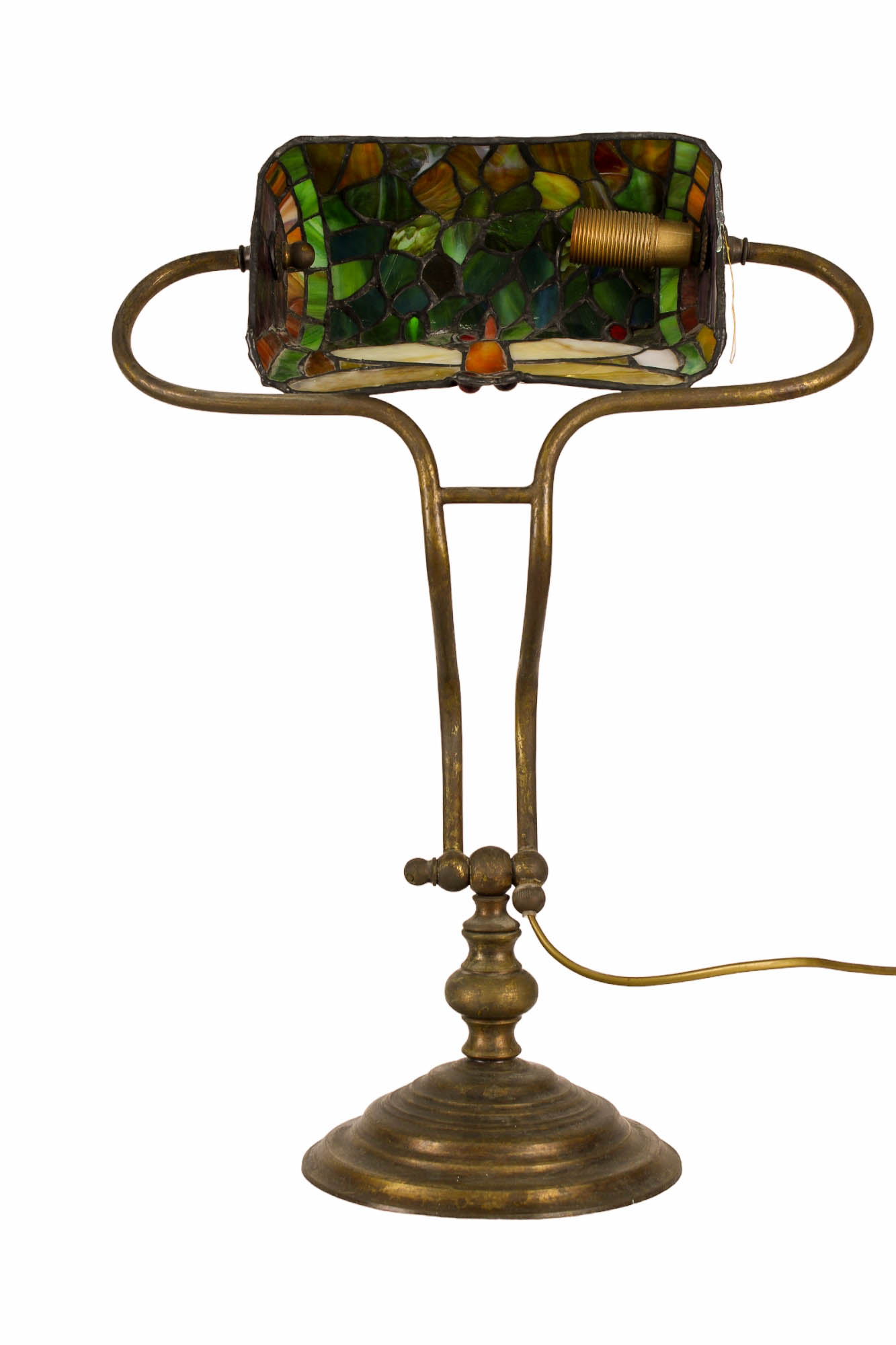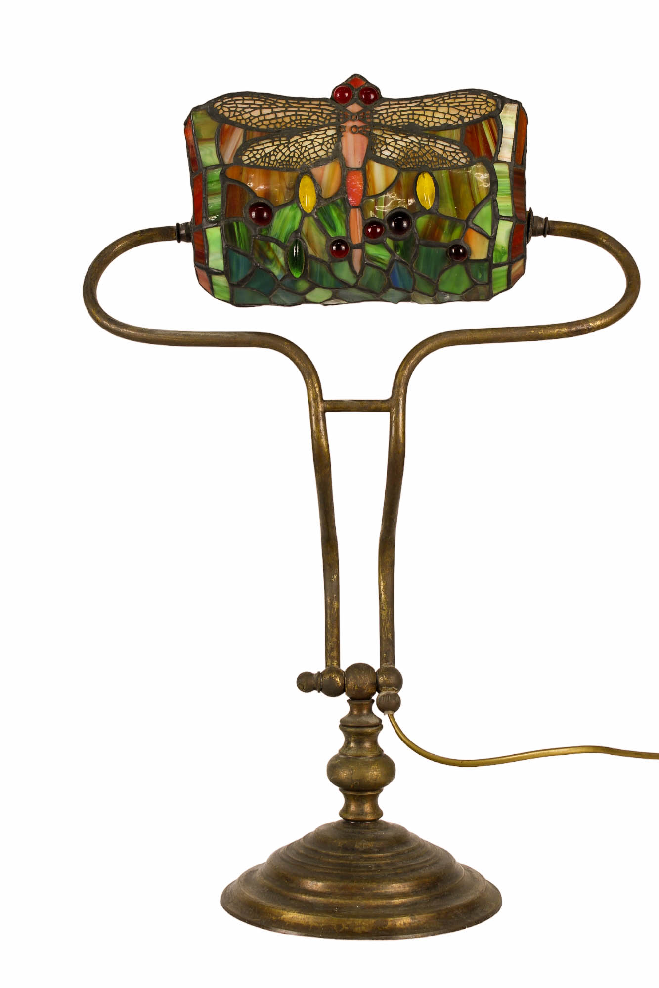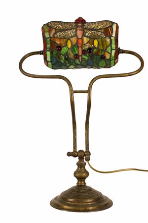 LAMPADA DA TAVOLO LIBERTY con struttura in ottone e plafoniera in pasta di vetro raffigurante libellula Francia primi 900 h cm 53,5 x 36 x 18