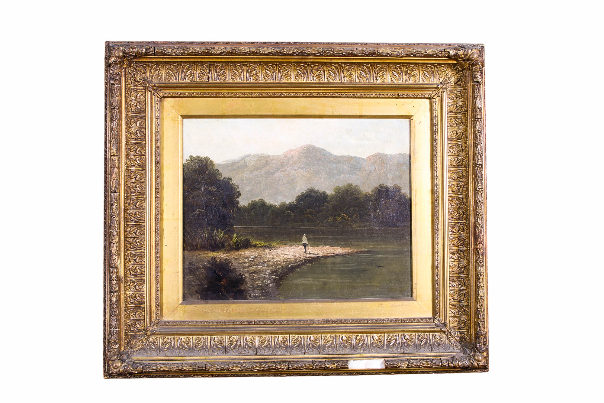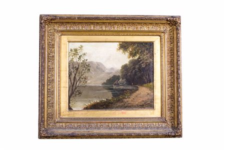 COPPIA DI DIPINTI OLIO SU TELA raffiguranti paesaggi lacustri dentro cornici in legno e pastiglia scuola inglese XIX secolo h cm 51,5 x 59,5
