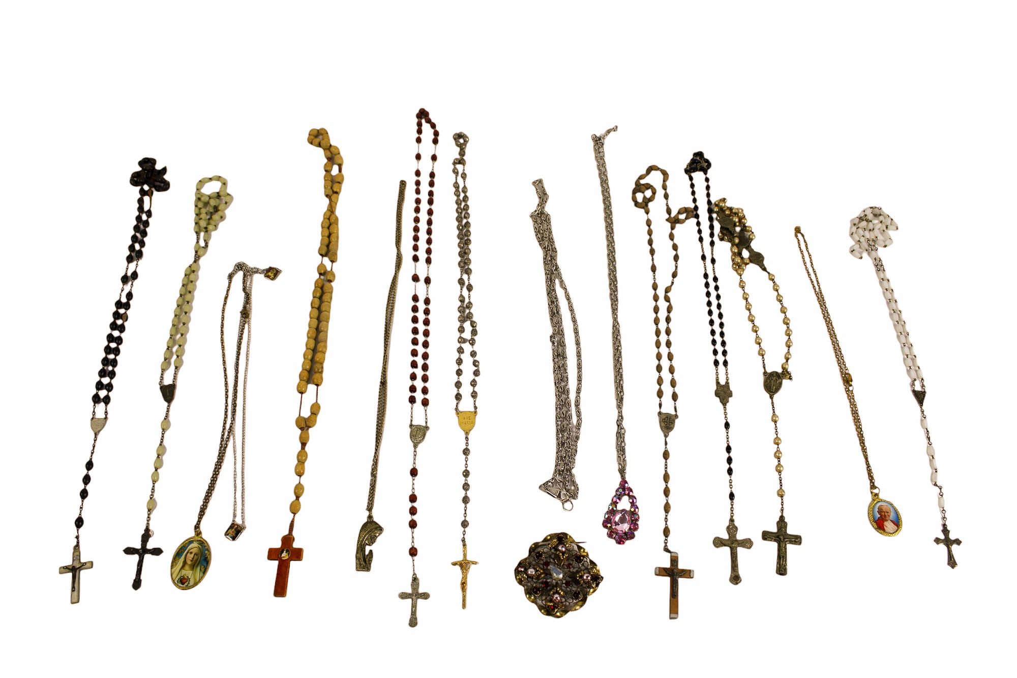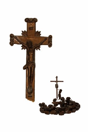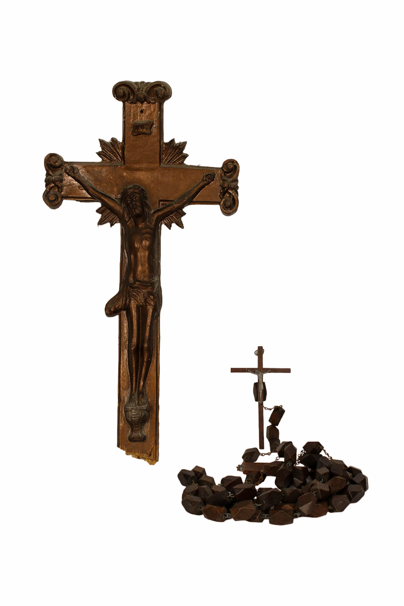 LOTTO COMPOSTO DA 1 crocifisso in legno scolpito e laccato e 1 lotto di rosari e oggetti vari diversa manifattura ed epoche h cm 52 x 28