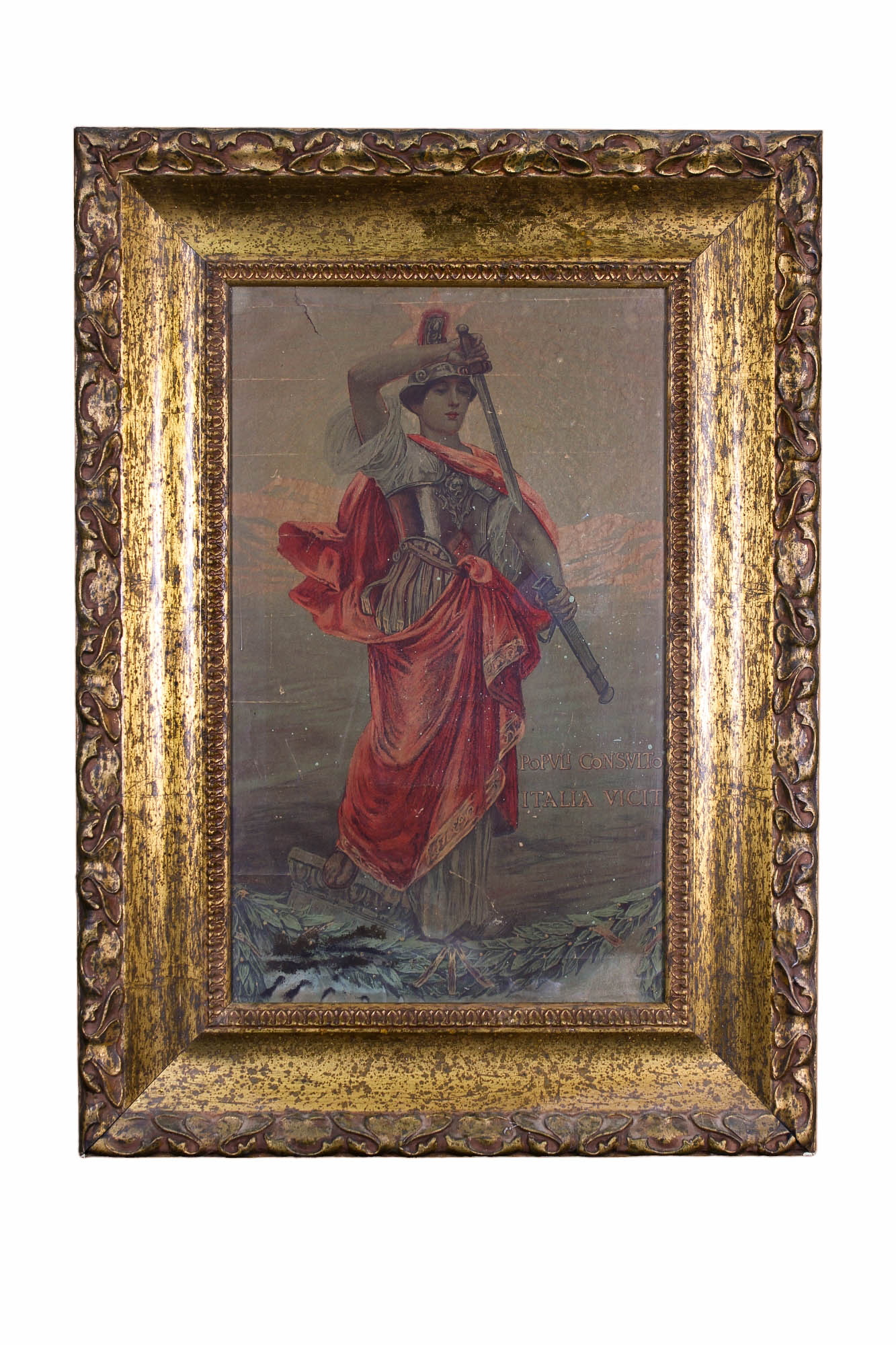CORNICE in legno dorato e pastiglia contenente stampa colorata Sicilia XX secolo h cm 78 x 57