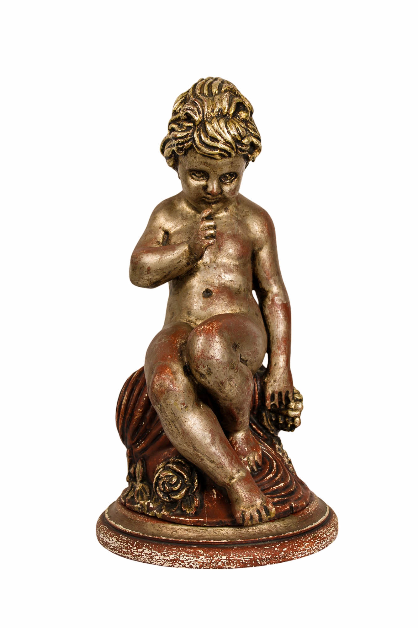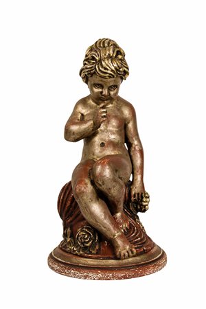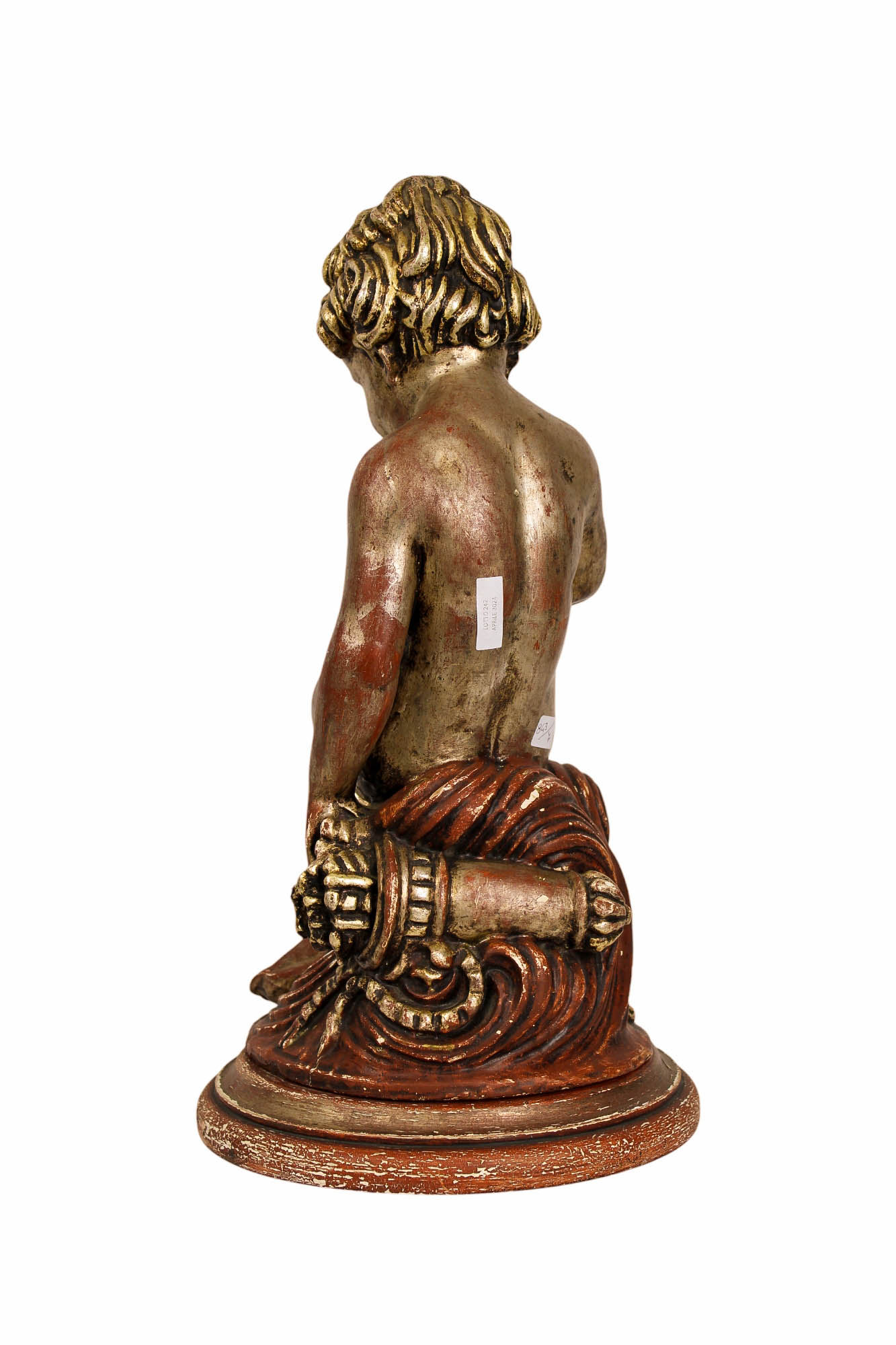 SCULTURA in legno scolpita a tutto tondo laccata e lumeggiata in oro raffigurante fanciullo seduto su scoglio maestranze siciliane XX secolo h cm 52 x 27