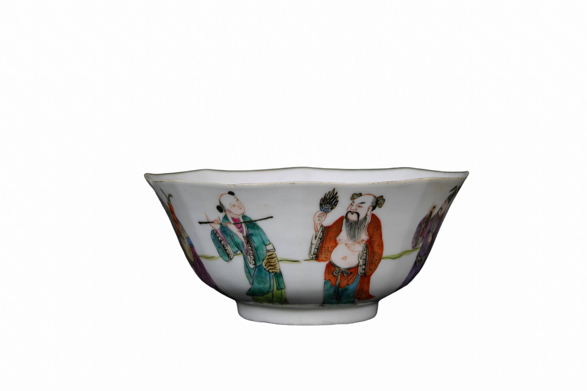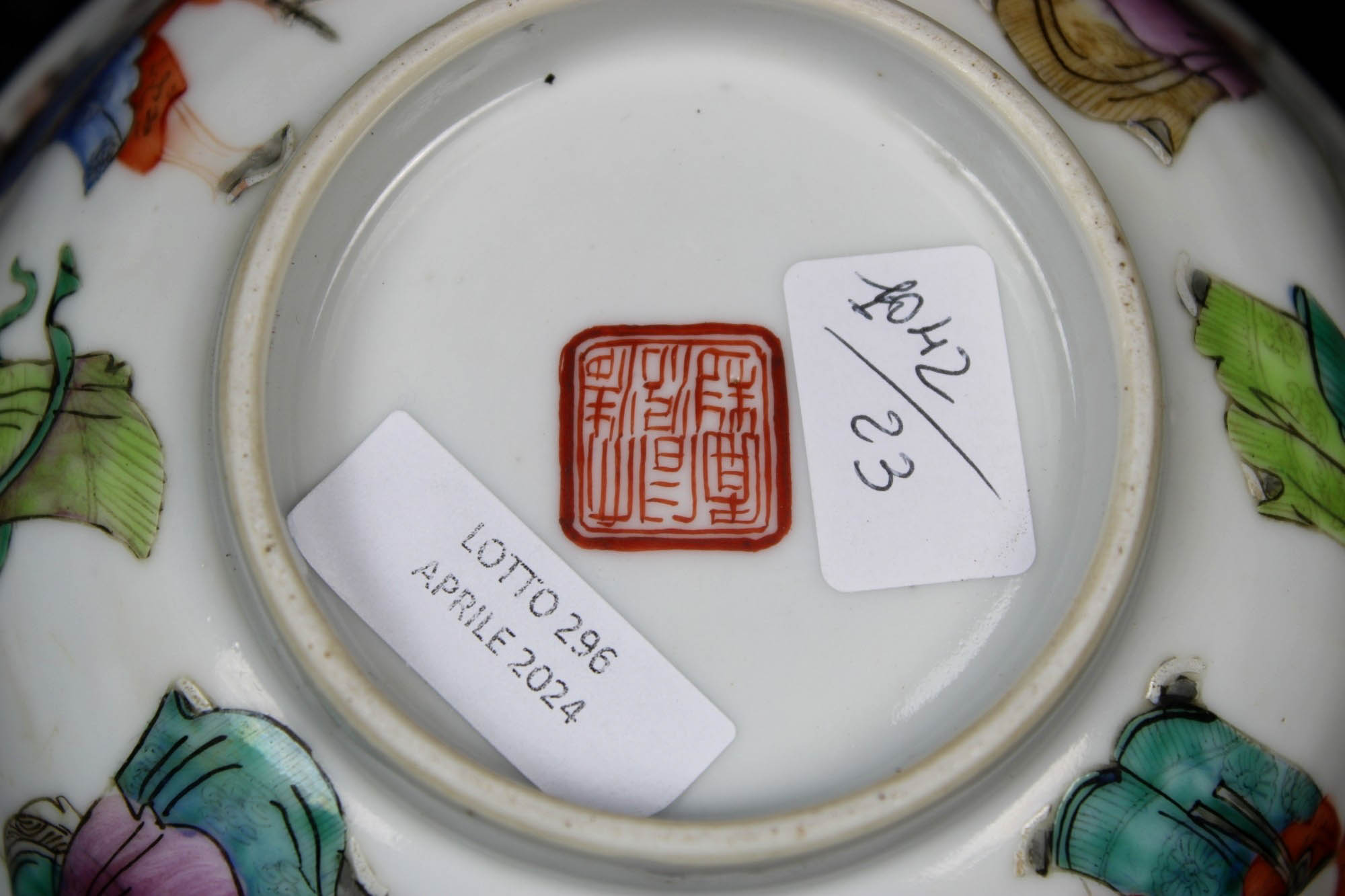 CIOTOLA in porcellana dipinta raffigurante personaggi orientali, sbeccature nel bordo Cina XIX secolo h cm 8 x 16,5