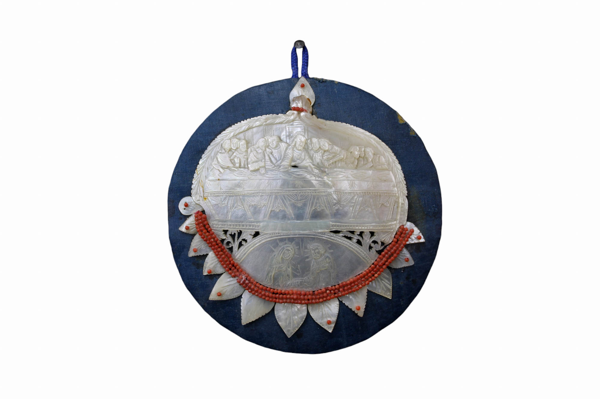 VALVA in madreperla finemente scolpita raffigurante ultima cena e natività arricchita da perline in corallo Sicilia XIX secolo Ø 15