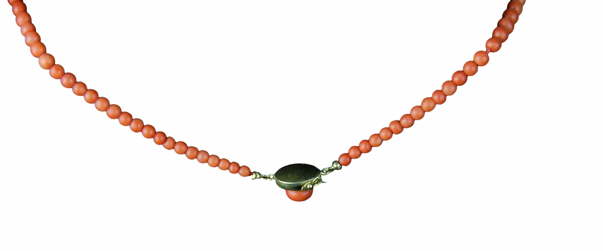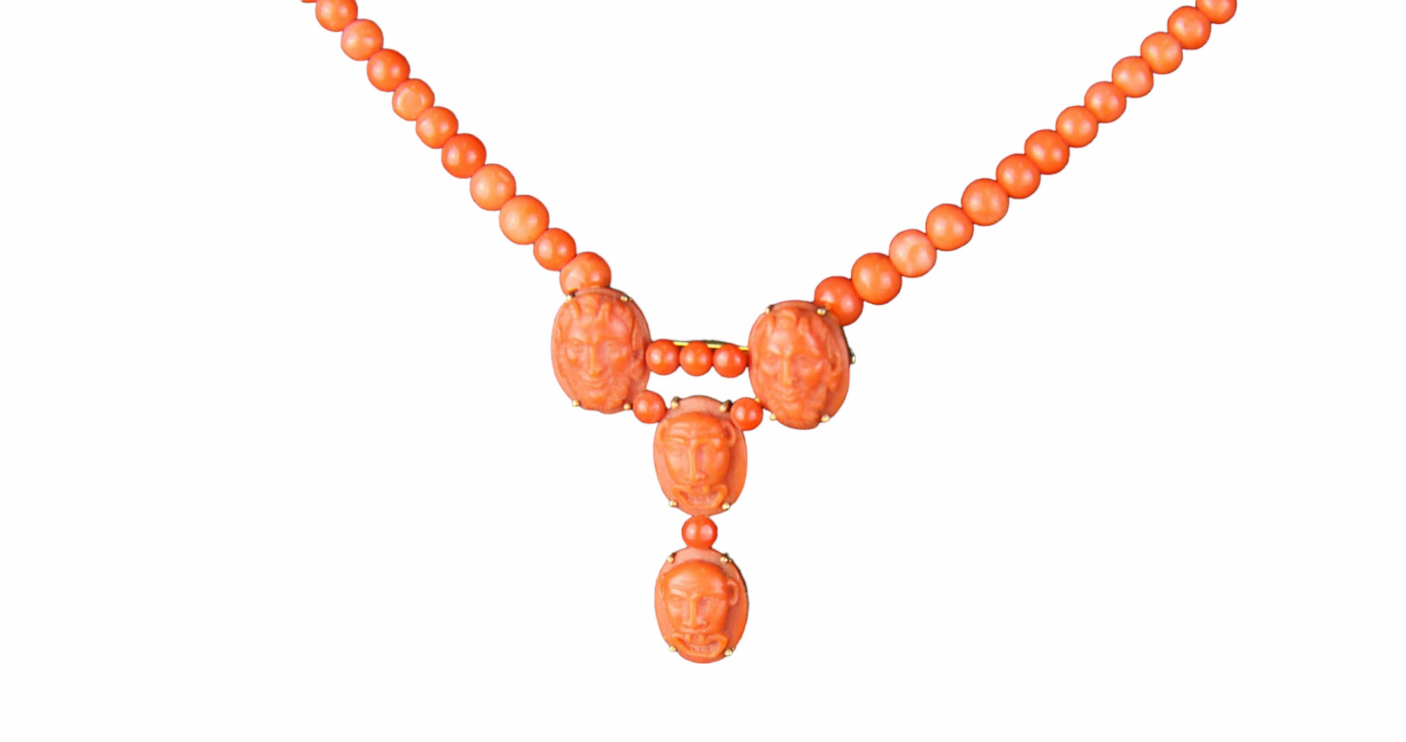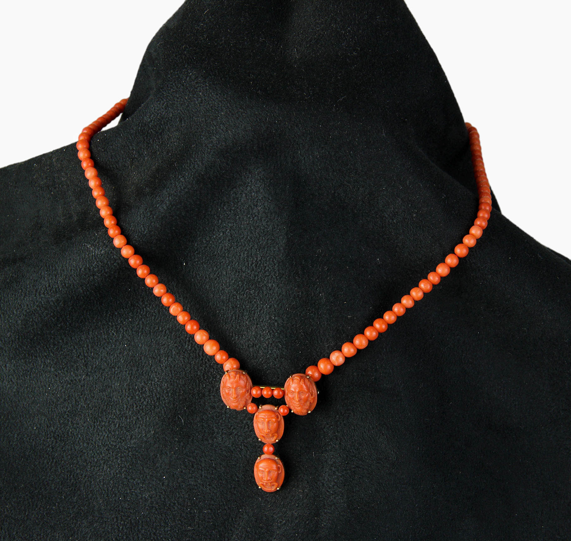 COLLANA in corallo rosso Mediterraneo composto da sfere e al centro arricchita da placche ovoidali con mascheroni antropomorfi in bassorilievo Sicilia XIX secolo