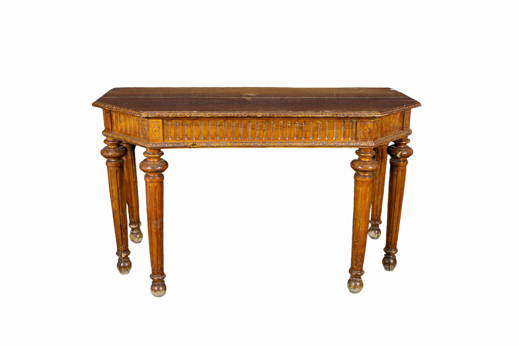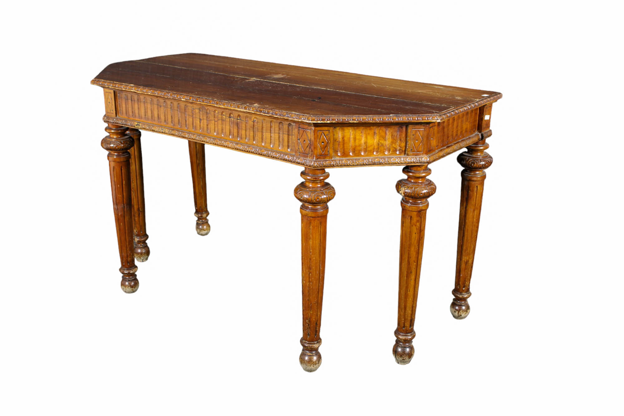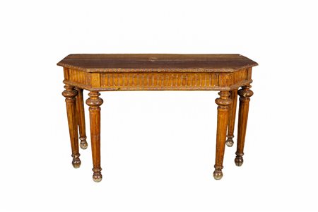 IMPORTANTE CONSOLLE in legno di noce finemente scolpita a 6 gambe tornite e scanalate maestranze siciliane 1780-1810 circa h cm 88 x 152 x 75