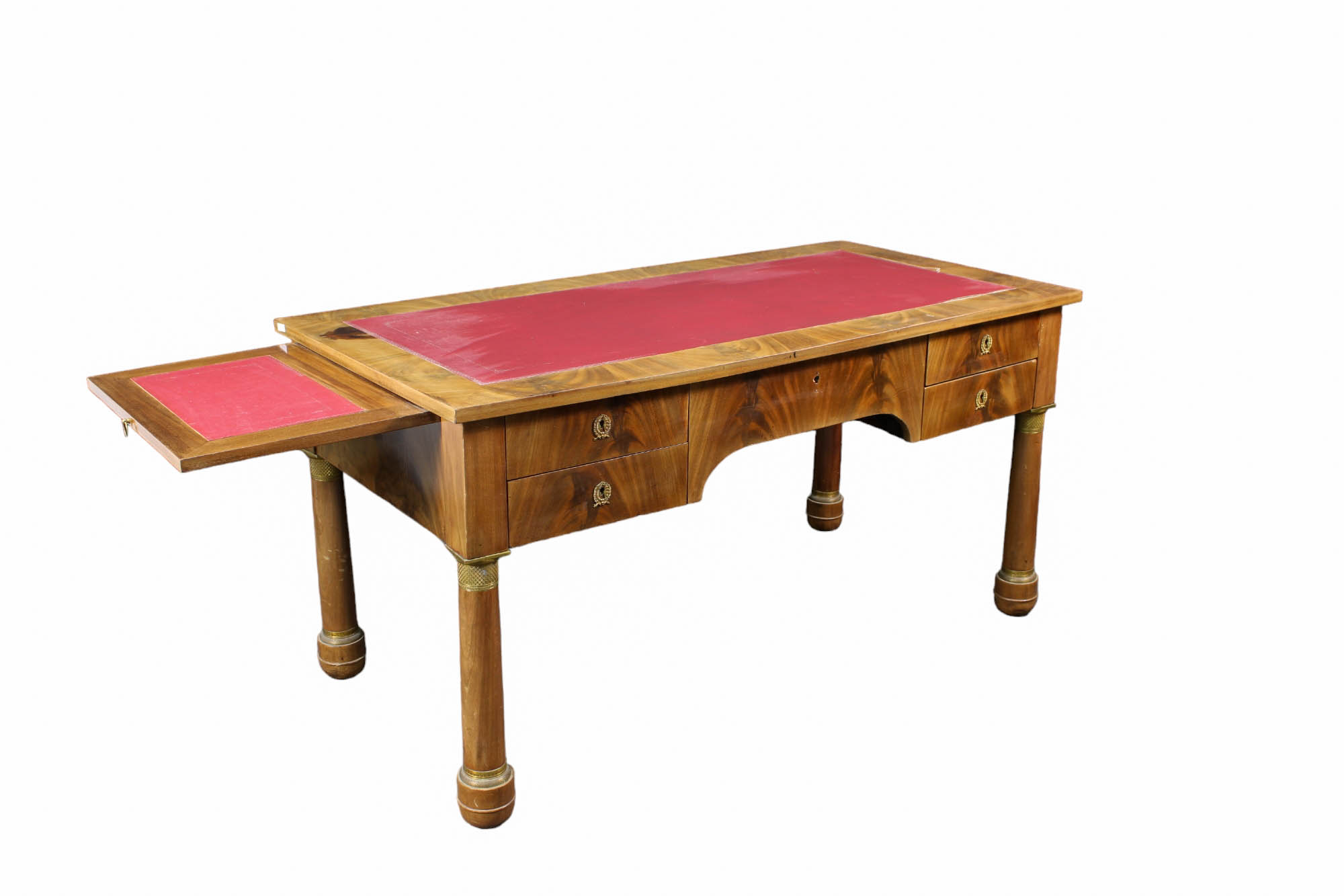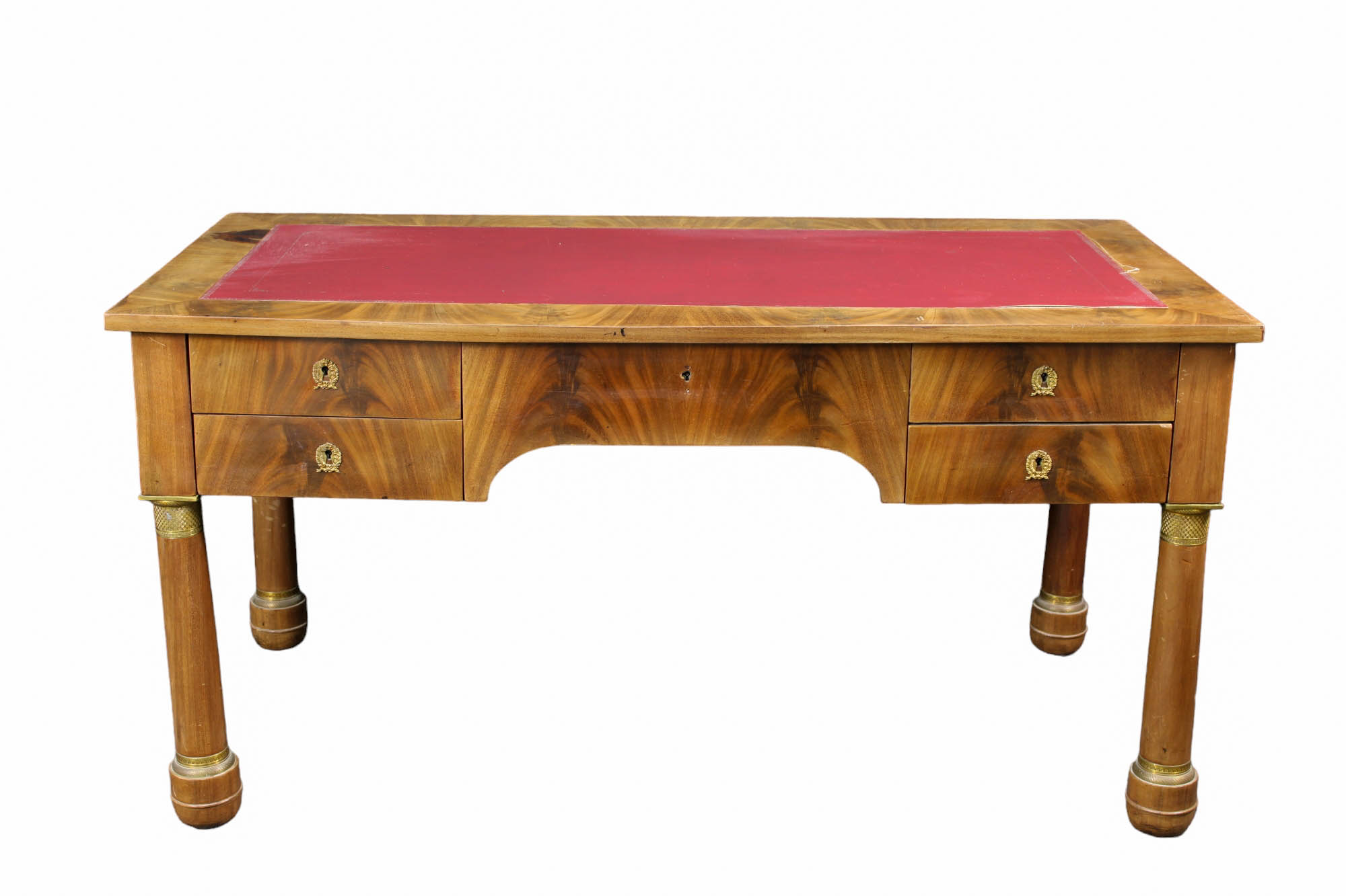 SCRIVANIA IMPERO in piuma di mogano a 5 cassetti gambe a colonna con capitelli in bronzo e piano in pelle rossa Francia XIX secolo h cm 76 x 150 x 74,5