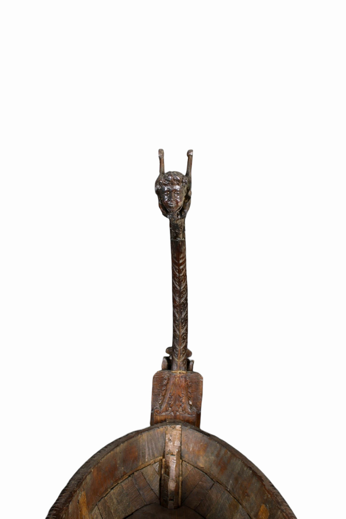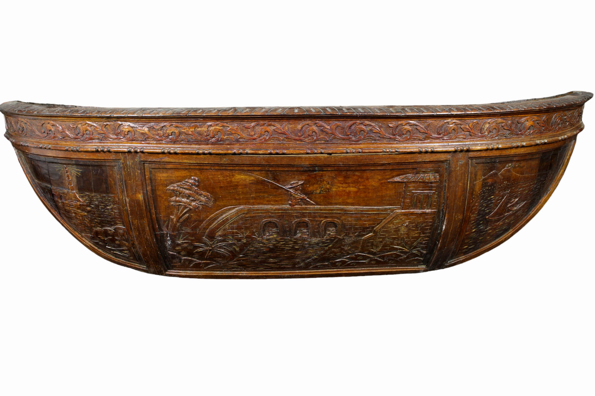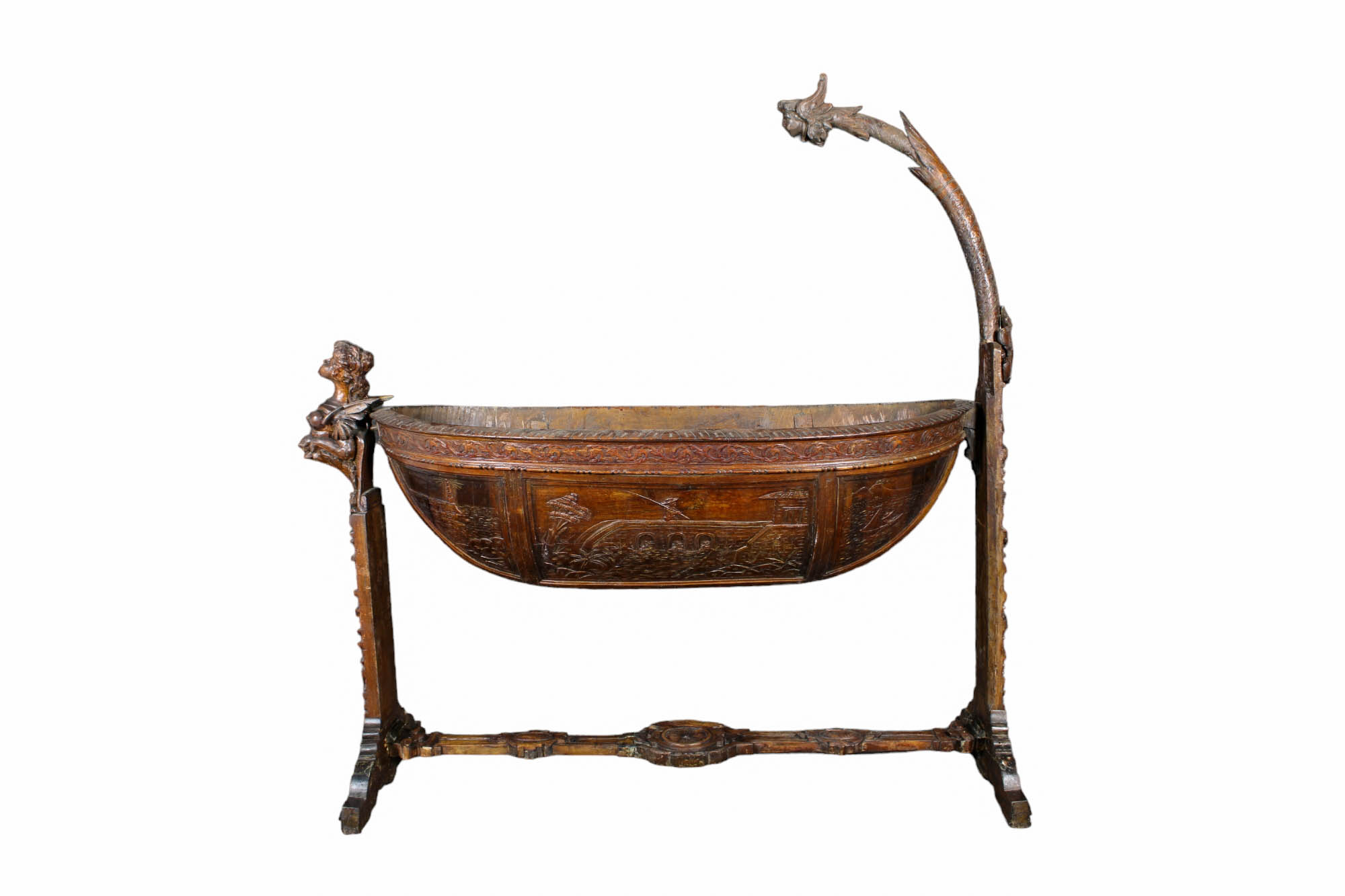 CURIOSA CULLA A BARCA in legno di noce riccamente scolpita raffiguranti figure fantastiche e paesaggi Sicilia XIX secolo h cm 165 x 158 x 55