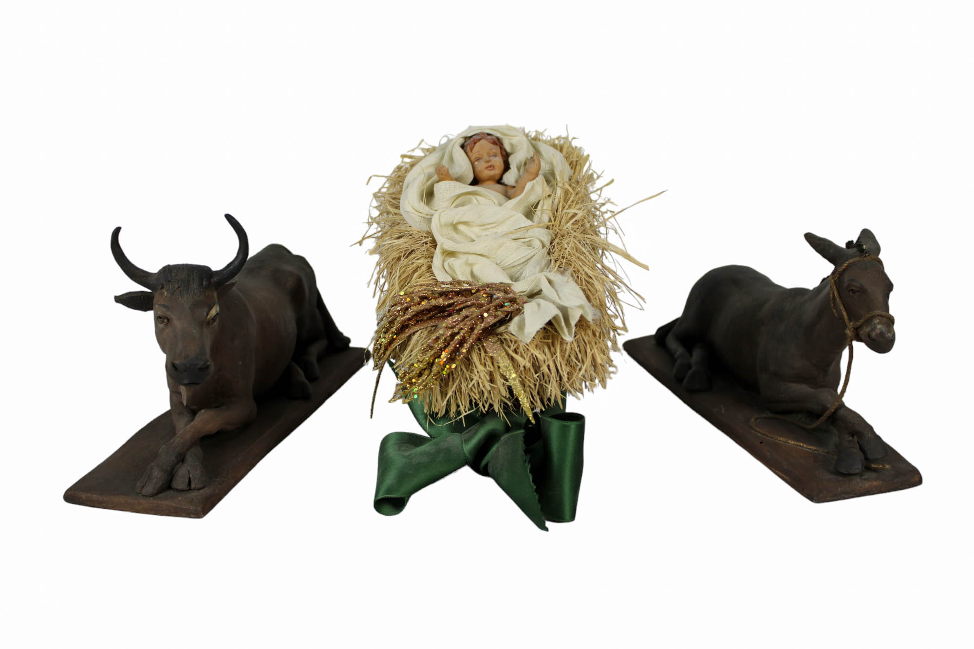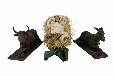 LOTTO COMPOSTO DA bue, asinello e bambinello in terracotta dipinta Sicilia XX secolo misure varie