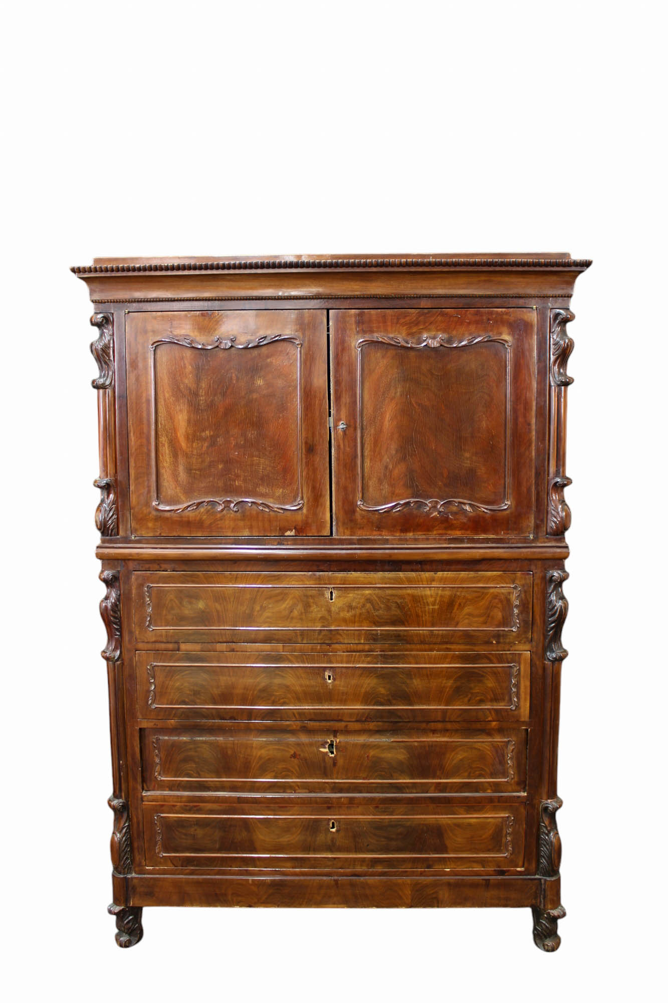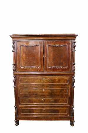 CHIFFONIER CARLO X in mogano a 4 cassetti nella parte inferiore e 2 sportelli nella parte superiore Sicilia XIX secolo h cm 192 x 134 x 60