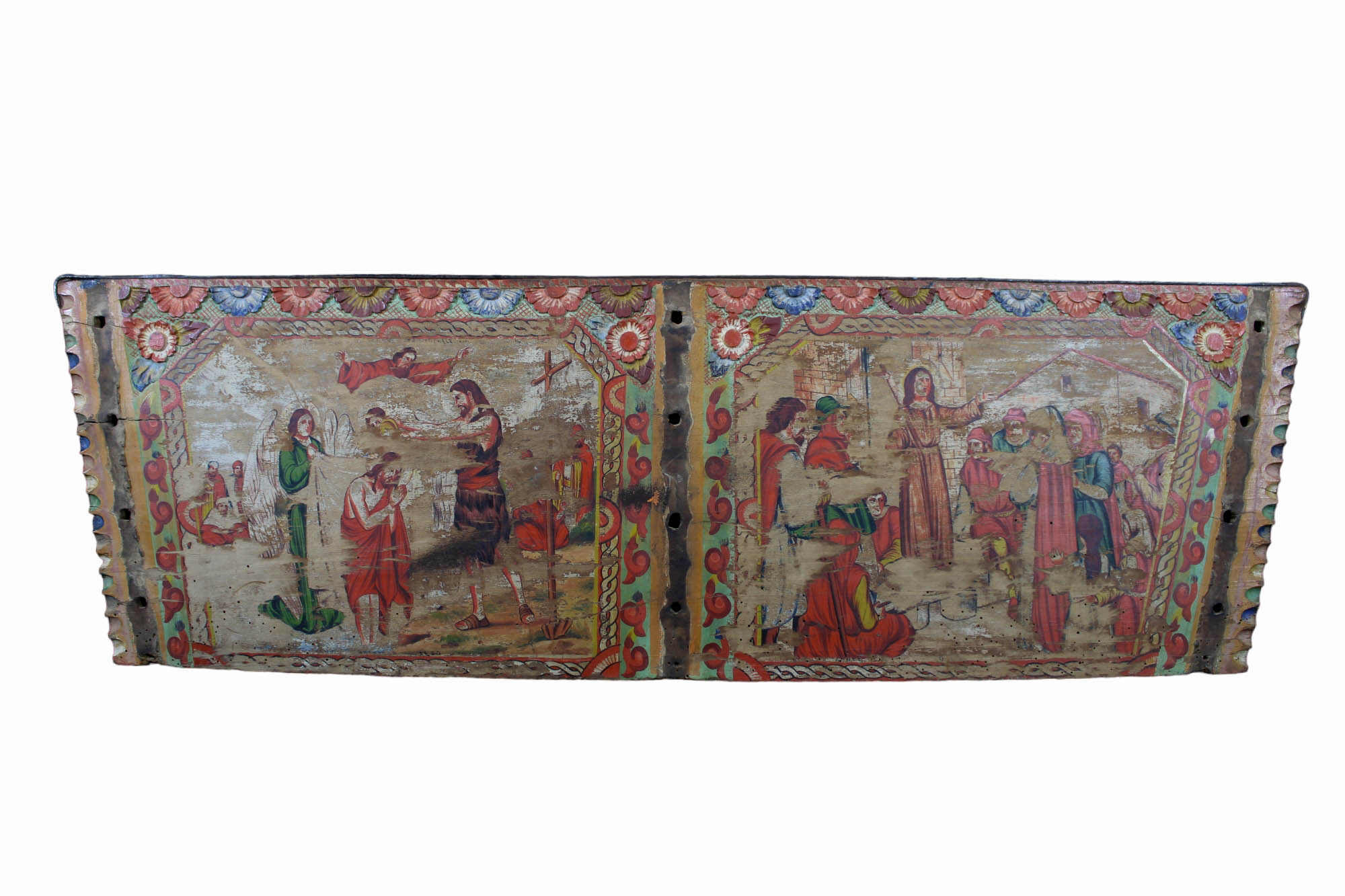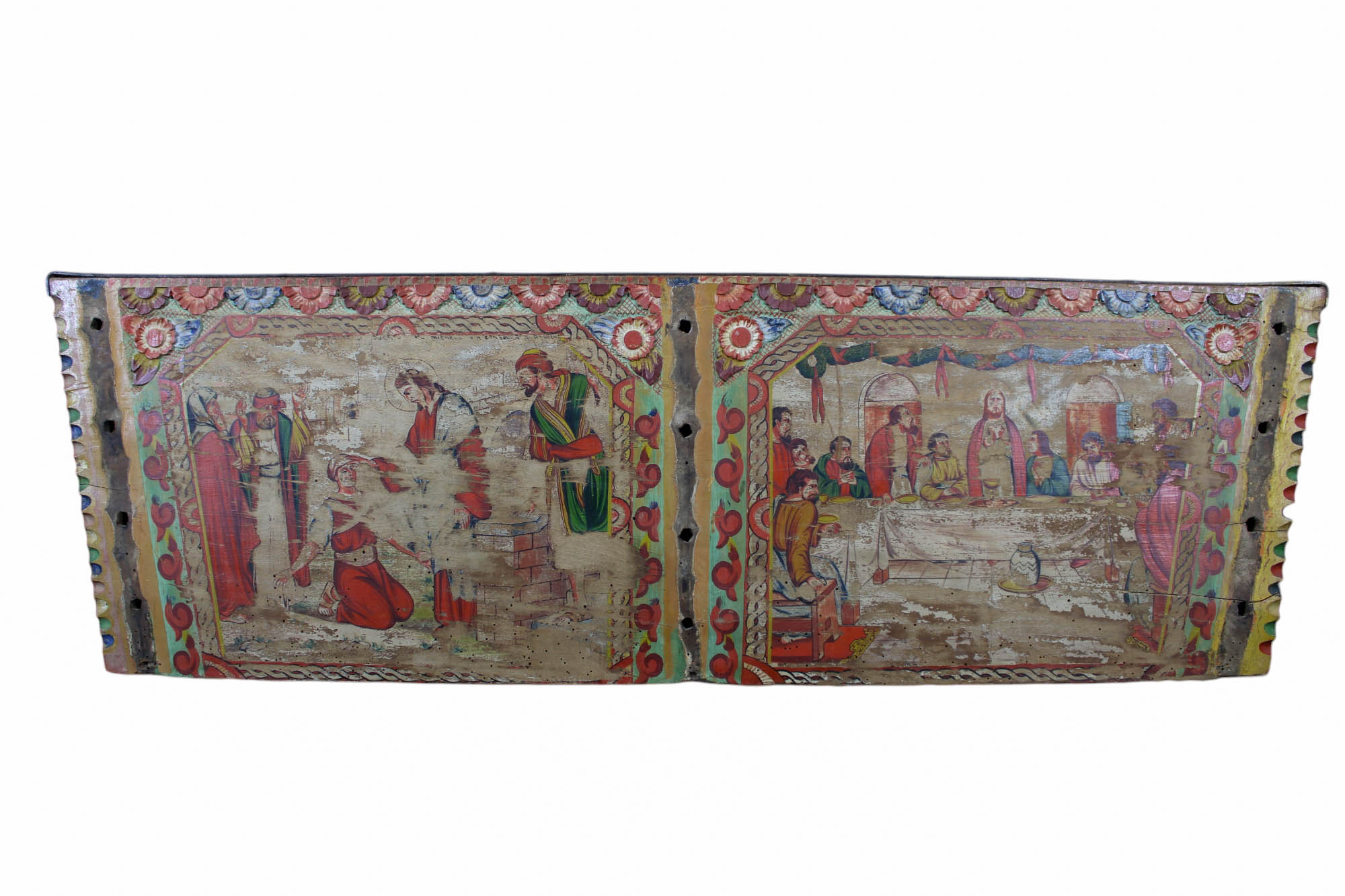 2 SPONDE DI CARRETTO DIPINTE raffiguranti scene sacre a firma fratelli Ducato Bagheria Primi 900 h cm 38 x 124