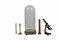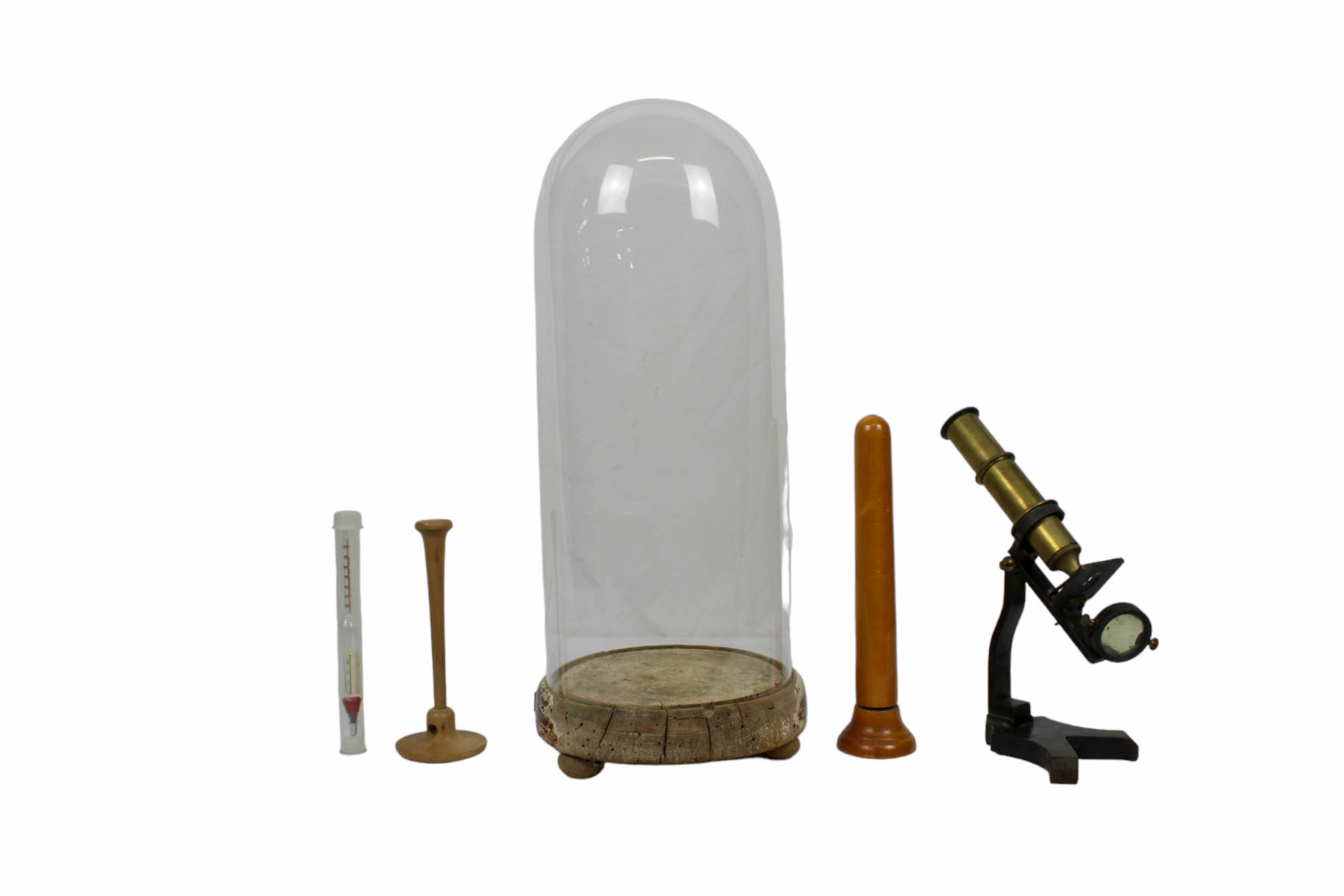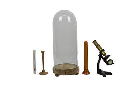 LOTTO COMPOSTO DA 1 campana in vetro con base in legno e 4 strumenti h cm 45 x 19