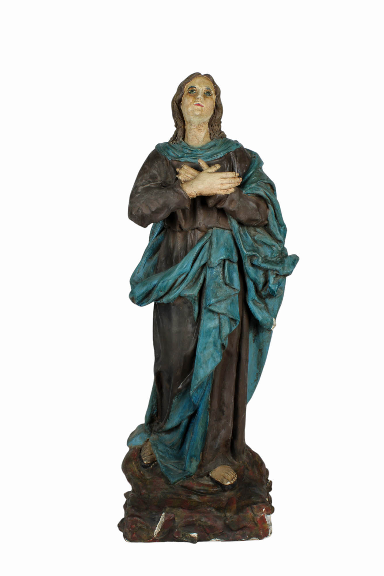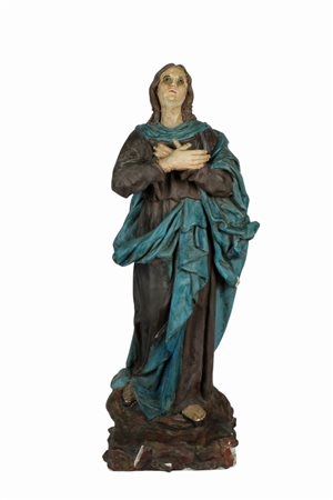 SCULTURA in cartapesta dipinta raffigurante Madonna, vecchi restauri usure del tempo e mancanze Sicilia fine 800' h cm 77 x 24 x 25