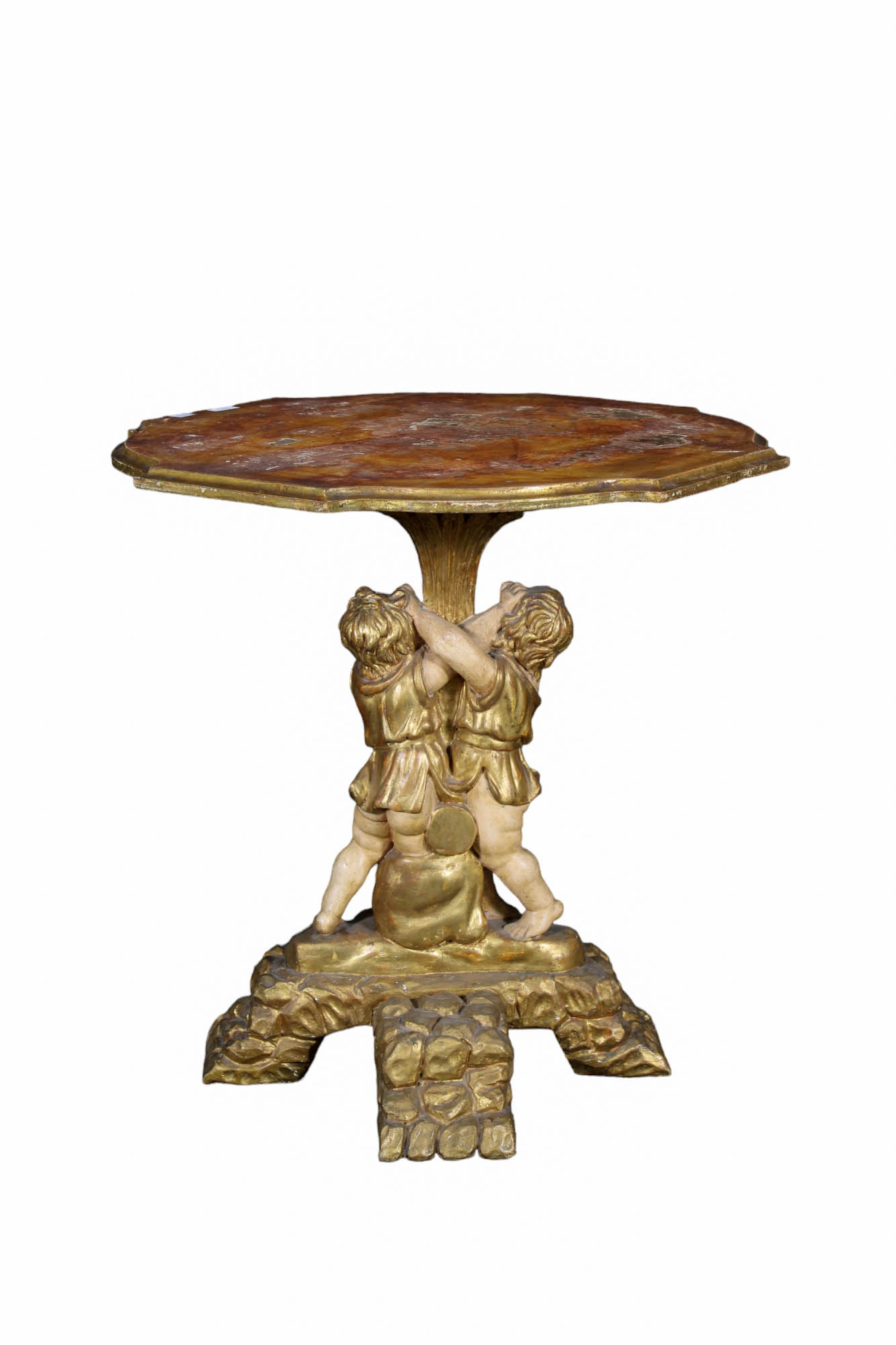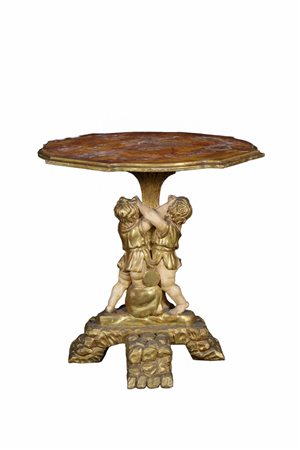 TAVOLINO DA SALOTTO in legno scolpito laccato e dorato con base raffiguranti fanciulli che sorreggono il piano laccato a finto marmo, usure del tempo Italia XIX/XX secolo h cm 68 x 66