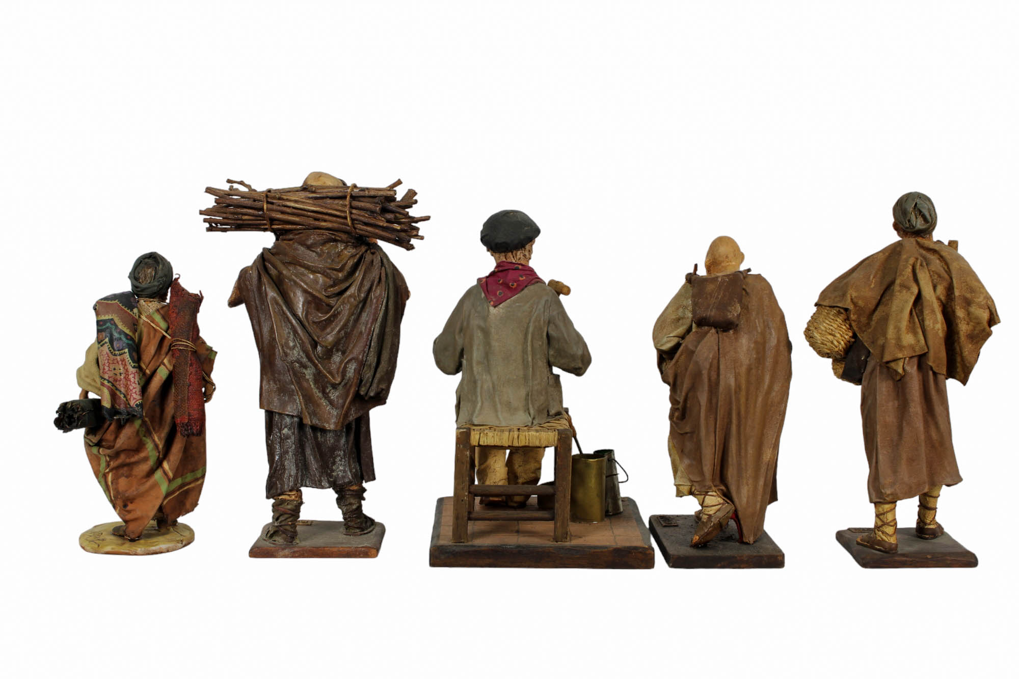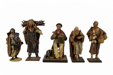 5 PASTORI DA PRESEPE in terracotta e cartapesta manifattura Conti e Tripi Sicilia XX secolo h cm 27 / h cm 25 / h cm 25,5 / h cm 22 / h cm 21