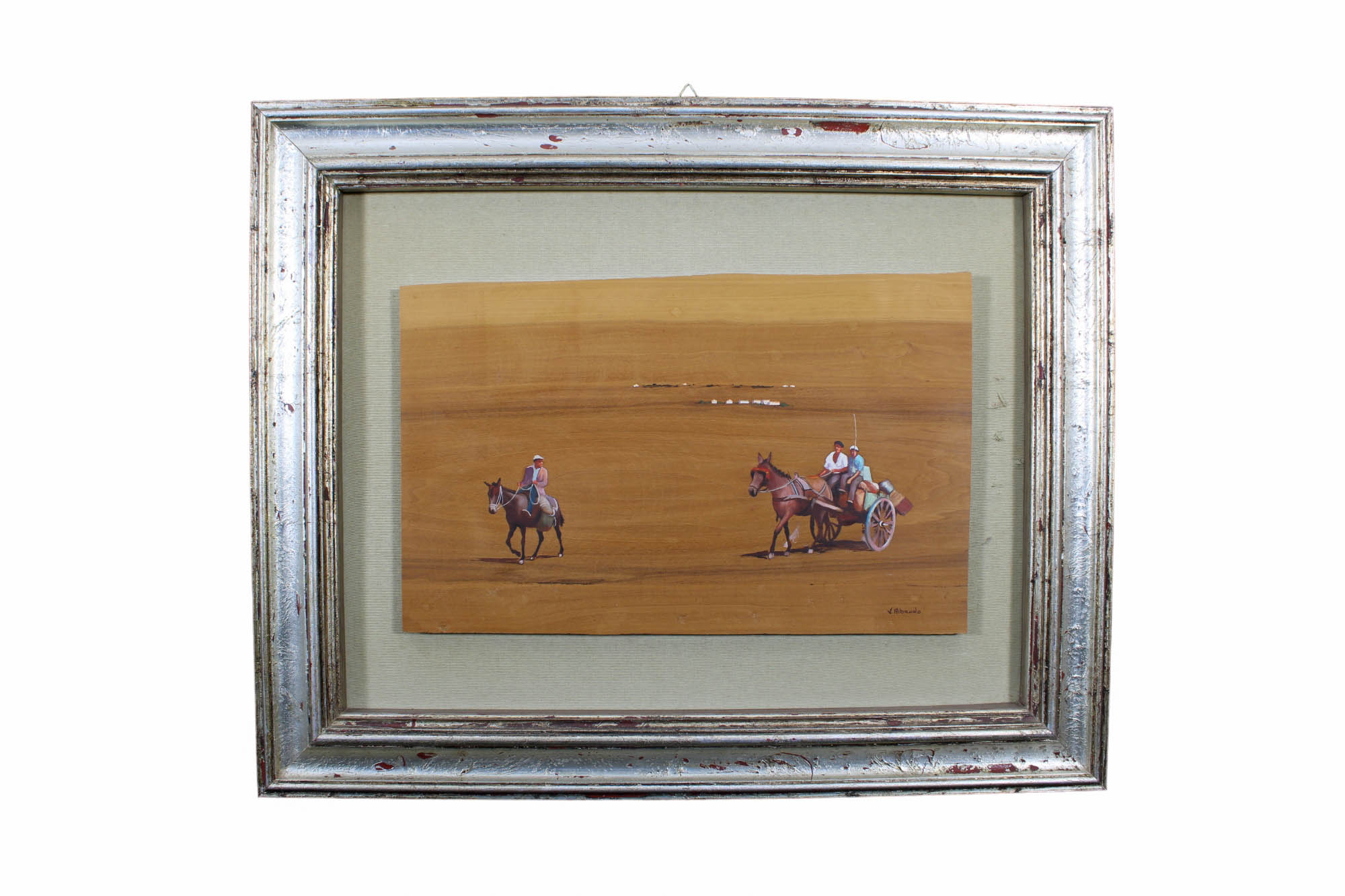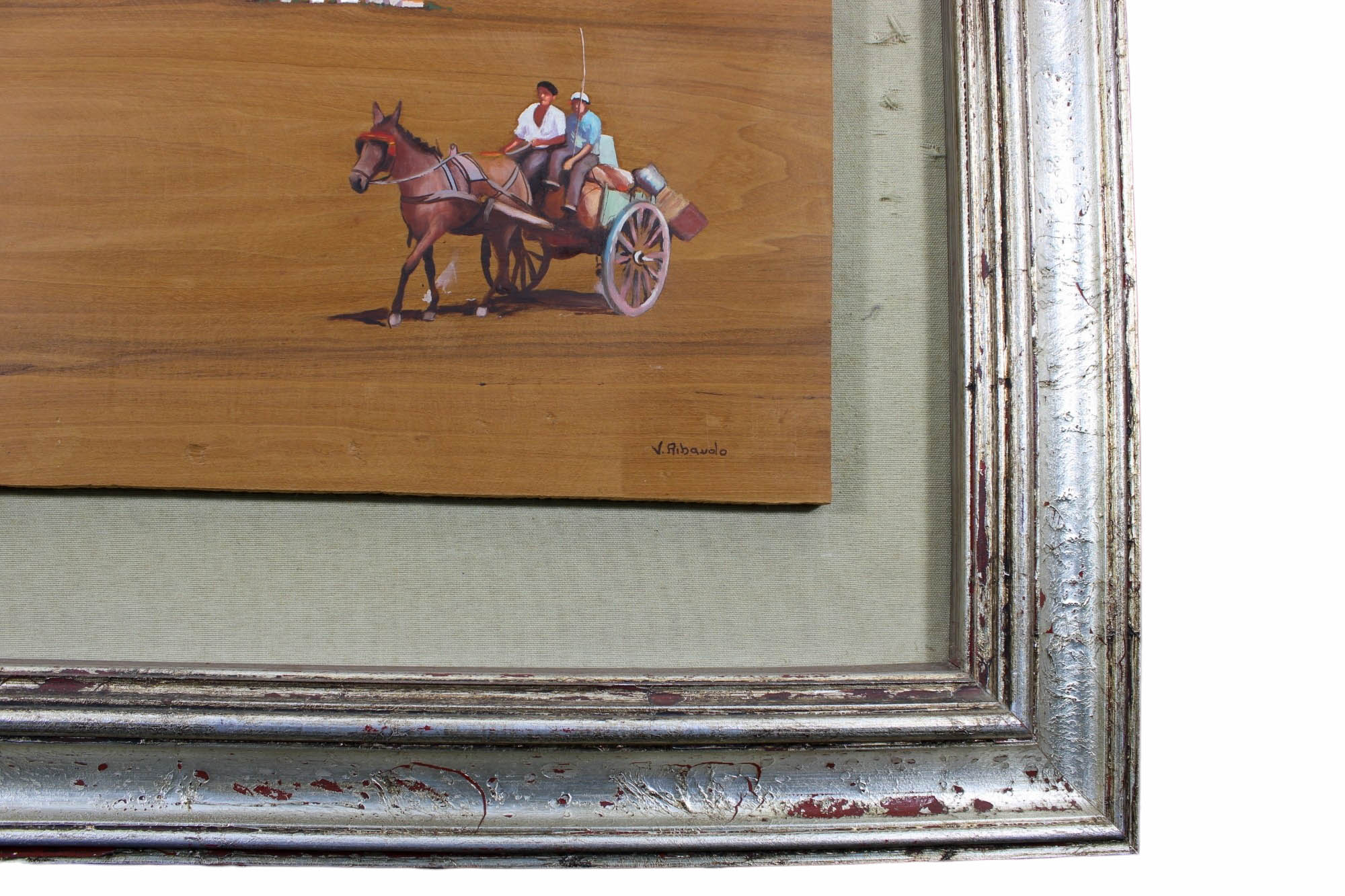DIPINTO SU TAVOLA di noce raffigurante personaggi con carretto e cavalli a firma V. Ribaudo Sicilia XX secolo h cm 38 x 61