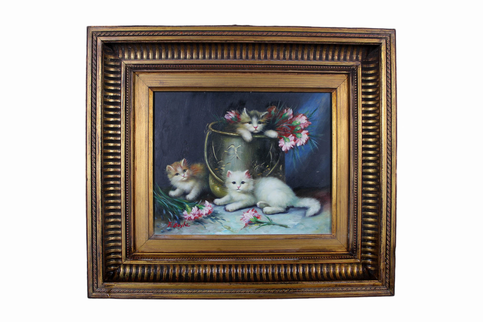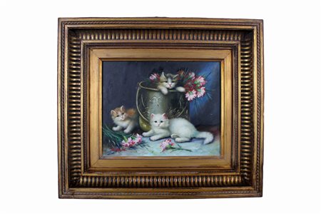 LOTTO COMPOSTO DA 2 dipinti su tavola 1 raffigurante bambina con gatto a firma Ticci e 1 raffigurante gattini a firma F.Baye dentro cornici in legno dorato XX secolo h cm 35 x 41 / h cm 41 x 36