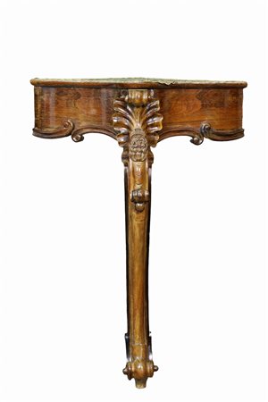 COPPIA DI CONSOLLE AD ANGOLO AD UNA GAMBA scolpita a virgola in legno di palissandro Sicilia XIX secolo h cm 99 x 70 x 56