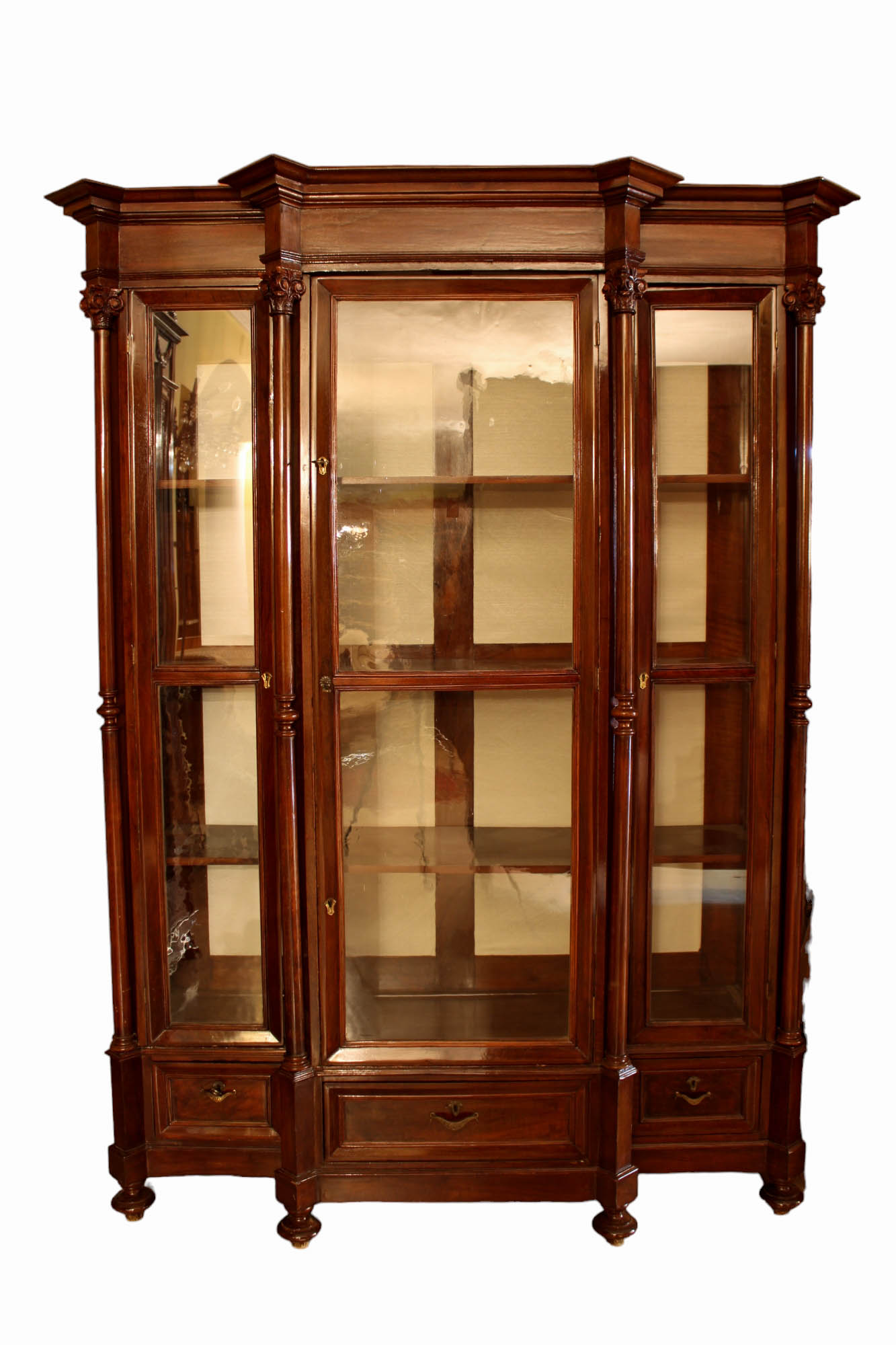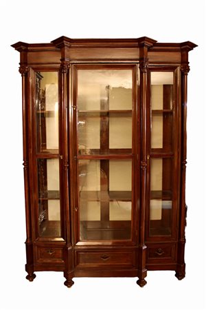 VETRINA in noce a 3 sportelli e 3 cassetti nella parte inferiore arricchita da colonne tornite e capitelli scolpiti Sicilia XIX secolo h cm 230 x 160 x 60