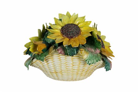 CENTROTAVOLA in ceramica policroma raffigurante cesto con girasole, piccole sbeccature manifattura capodimonte XX sec h cm 25 x 30 x 25