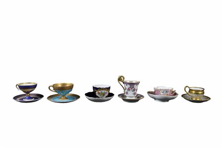 LOTTO DI 6 TAZZE in porcellana dipinta e lumeggiatura in oro diverse manifatture XIX/XX secolo misure varie