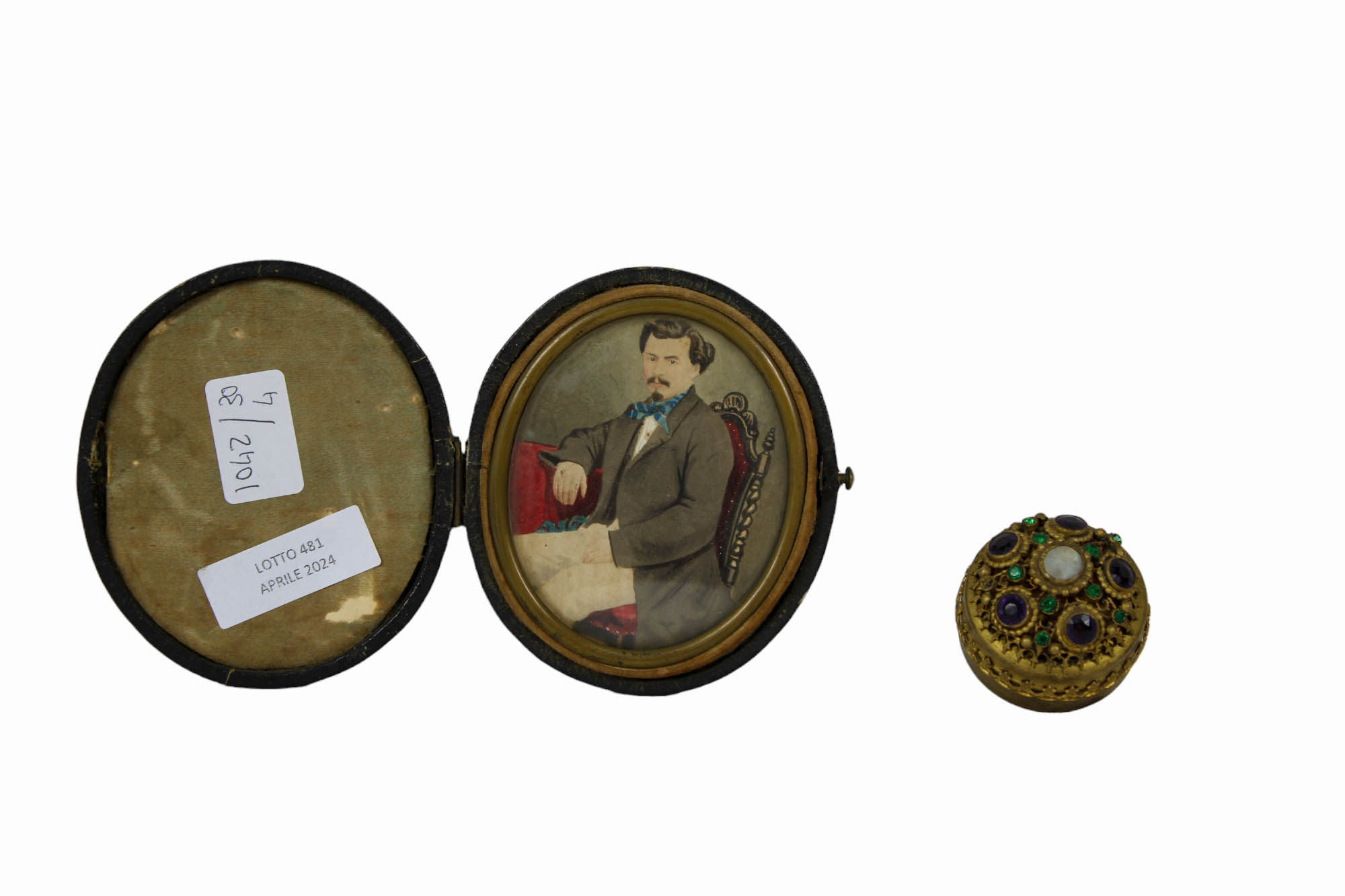 LOTTO COMPOSTO DA 2 porta fotografie, un ventaglio e un porta pillole in diversi materiali e stili XIX / XX secolo misure varie