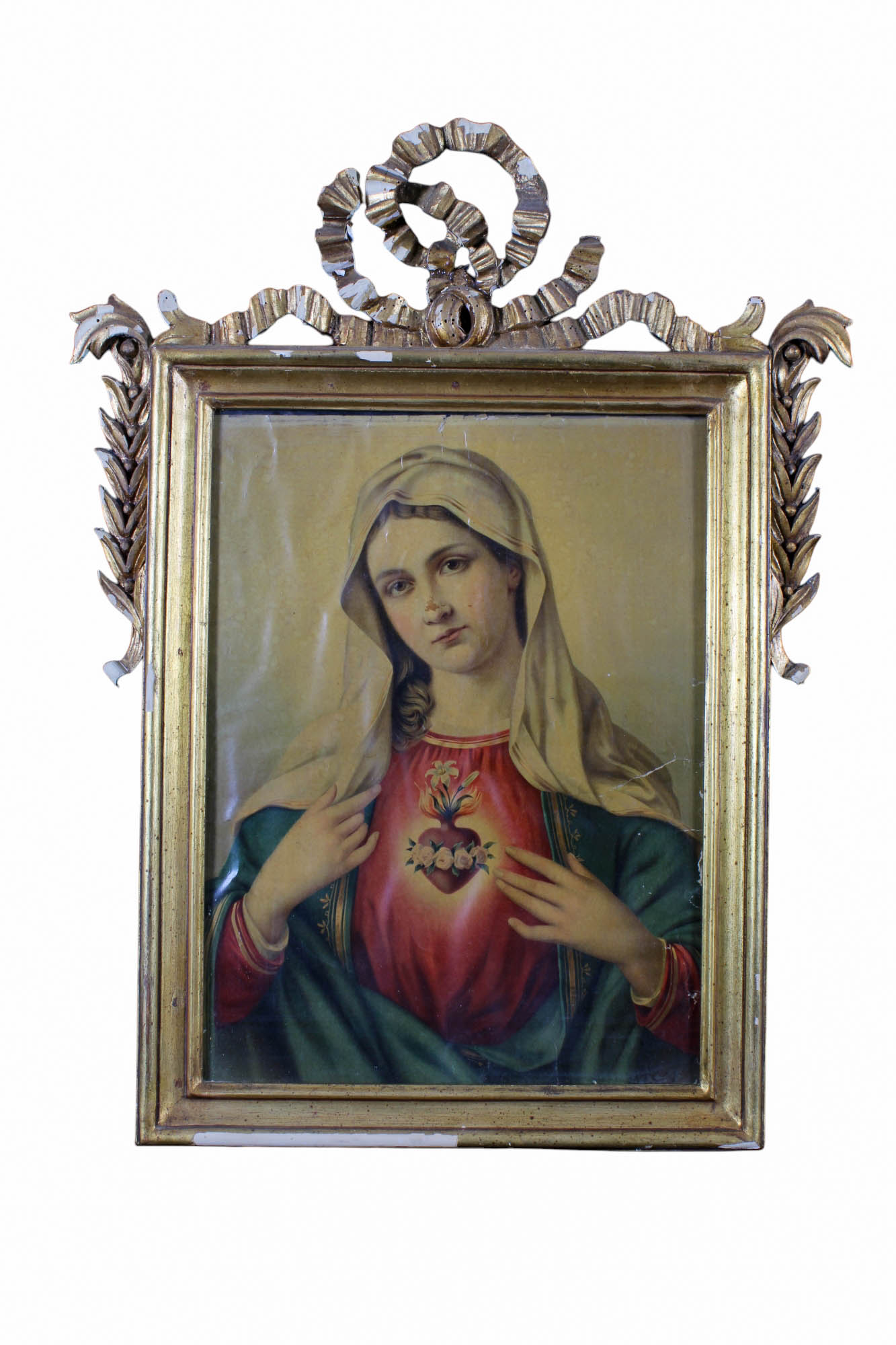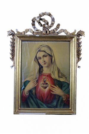 CORNICE in legno intagliato a nastrini e dorato contenente stampa colorata raffigurante Madonna, incollaggi rotture e mancanze Sicilia primi 900 h cm 86 x 66