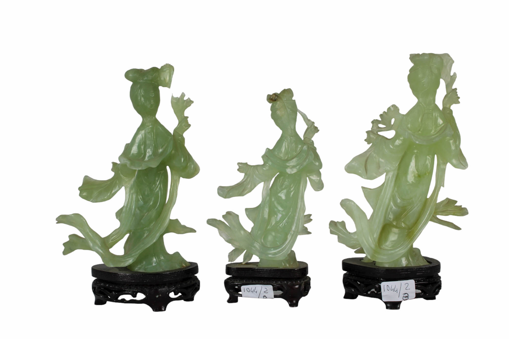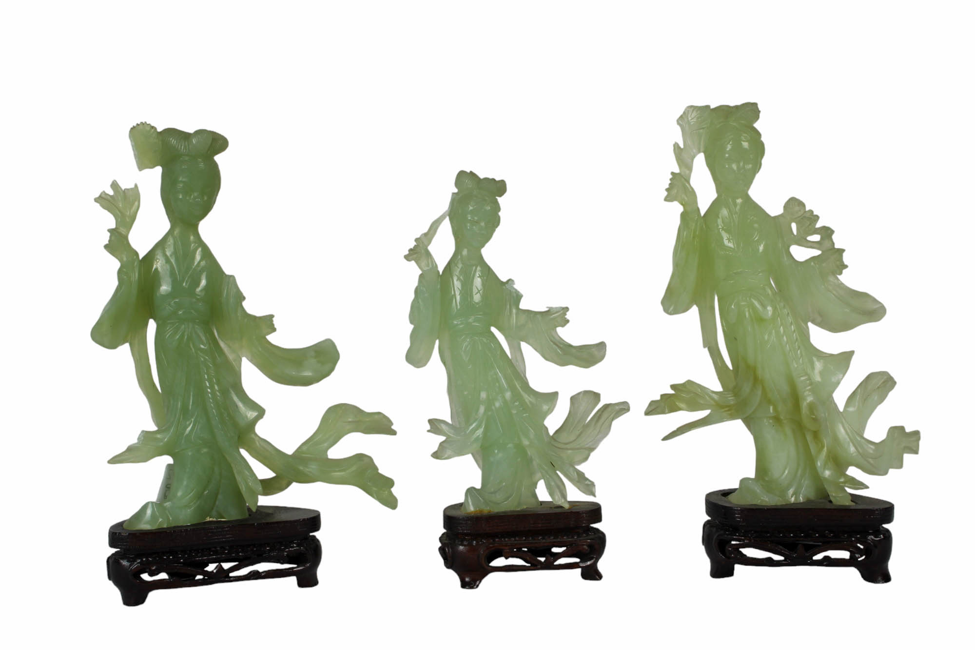 3 SCULTURE in giada verde raffigurante geishe con base in legno, rotture e mancanze manifattura orientale XX secolo h cm 20 / h cm 18 / h cm 20