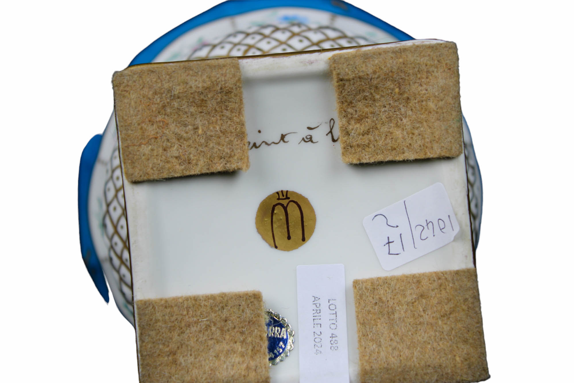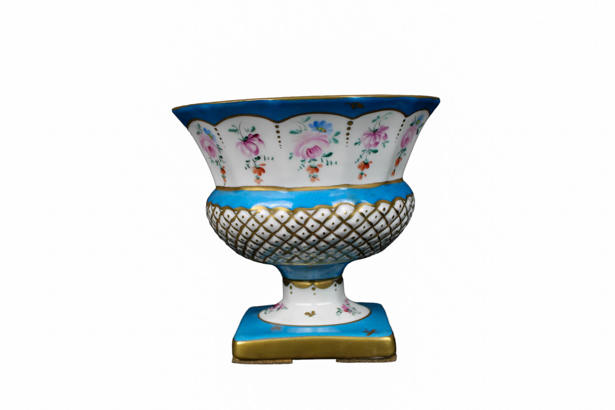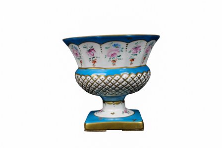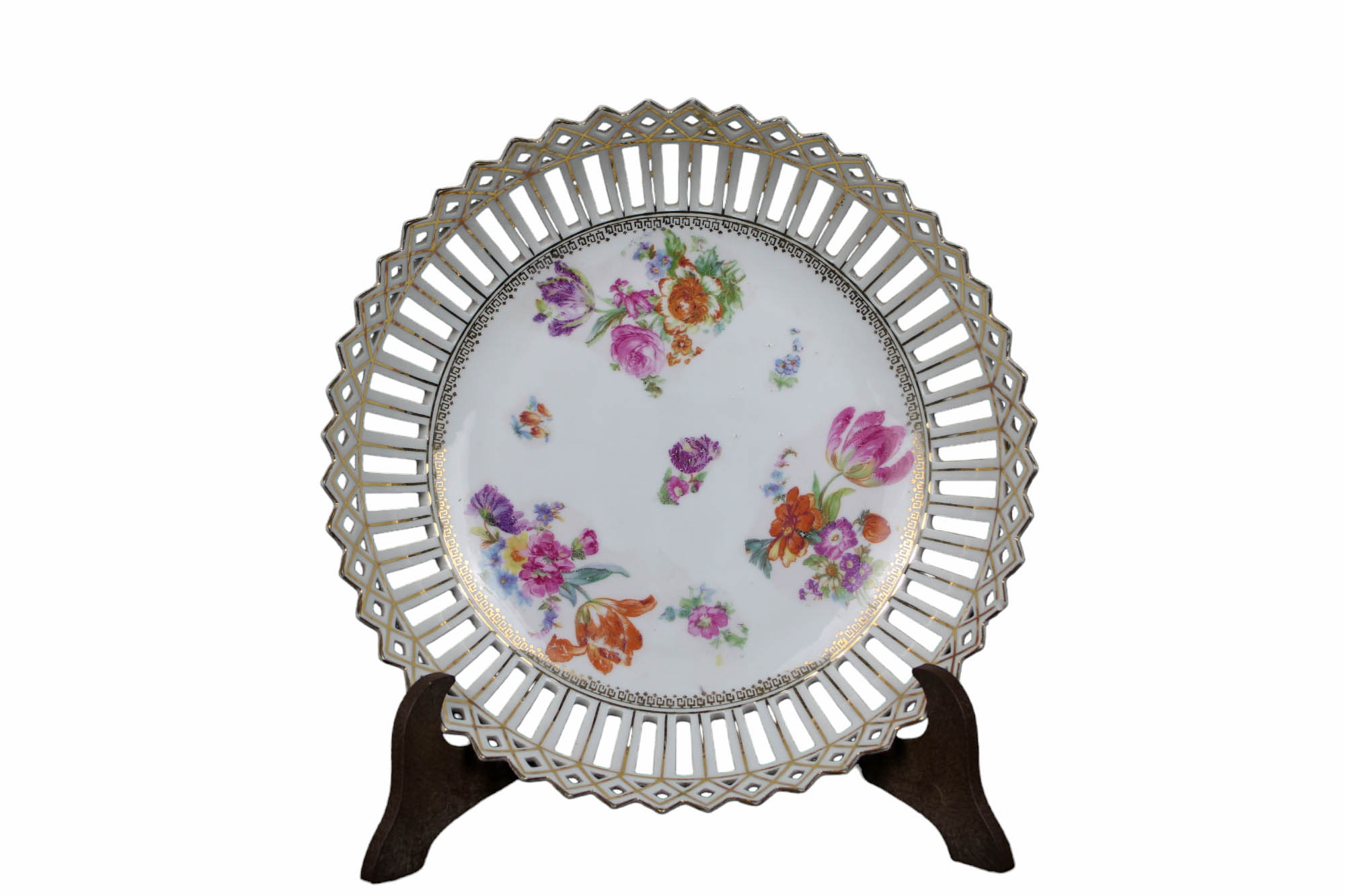 LOTTO COMPOSTO DA un vaso e un piatto traforato in porcellana dipinta a motivi floreali con lumeggiature in oro manifattura francese XX secolo h cm 15 x 16,5 / Ø 25