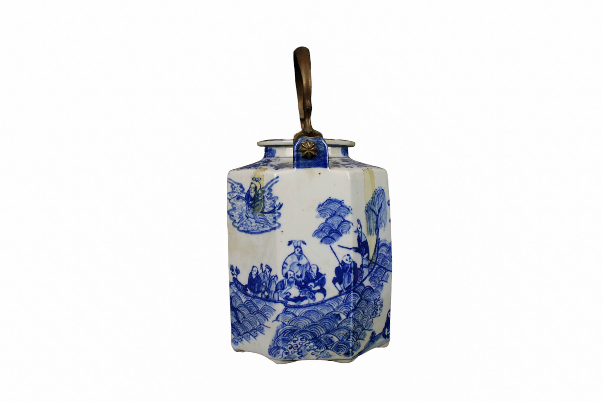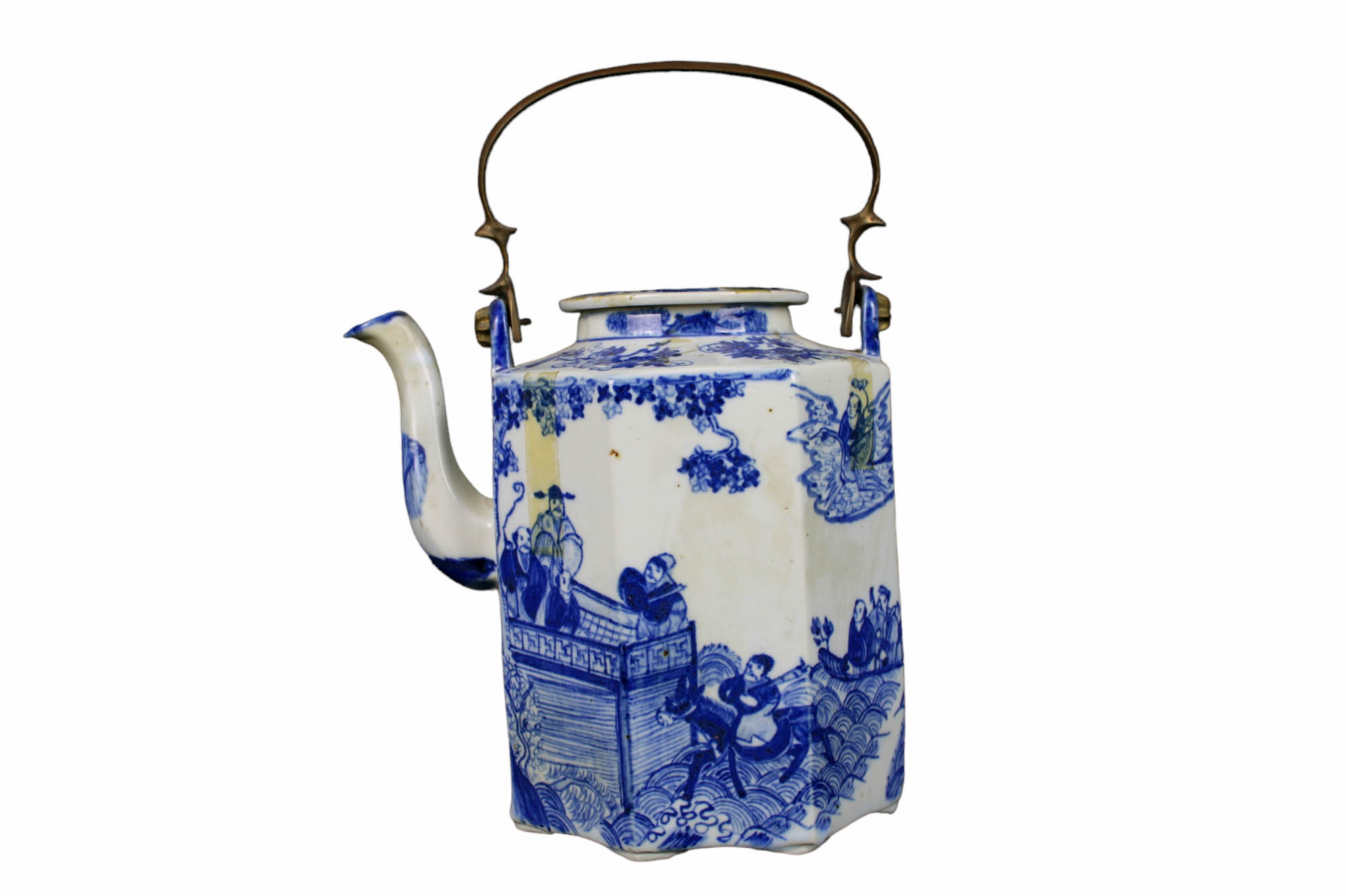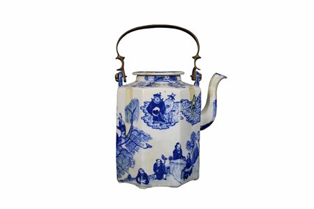 TEIERA in porcellana dipinta con manico in bronzo manifattura orientale primi 900 h cm 27 x 15 x 20