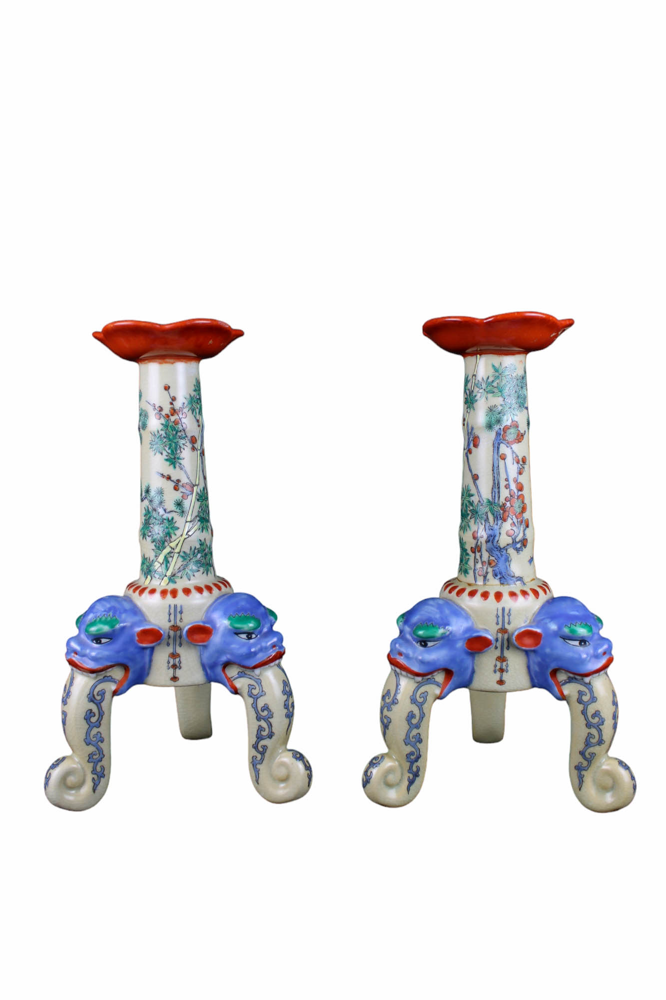 DUE PORTA CANDELE in ceramica porcellanata e dipinta manifattura orientale XX secolo h cm 30,5 x 16,5