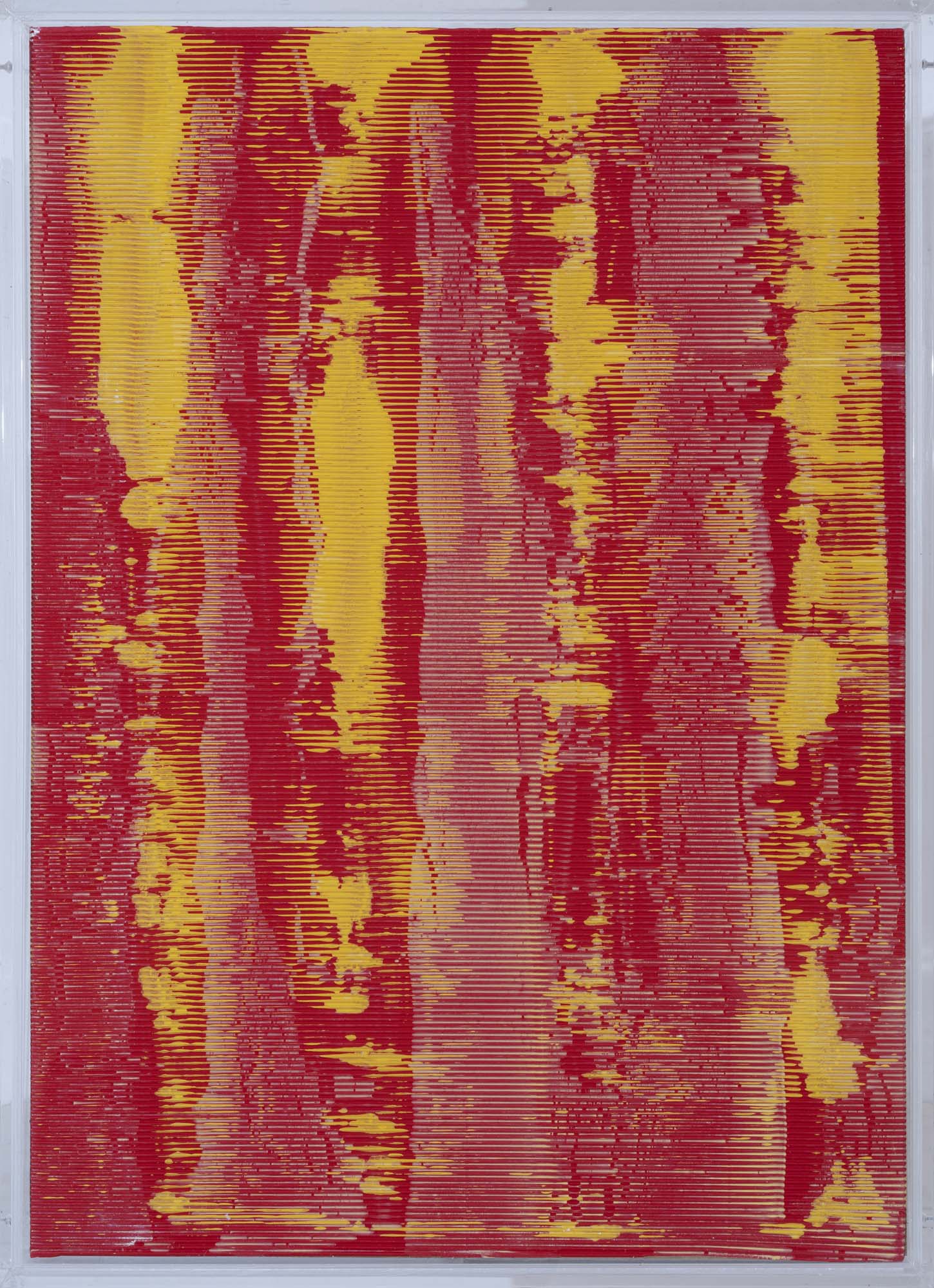 tecnica mista su cartone ondulato entro teca in plexiglass cm. 70x50