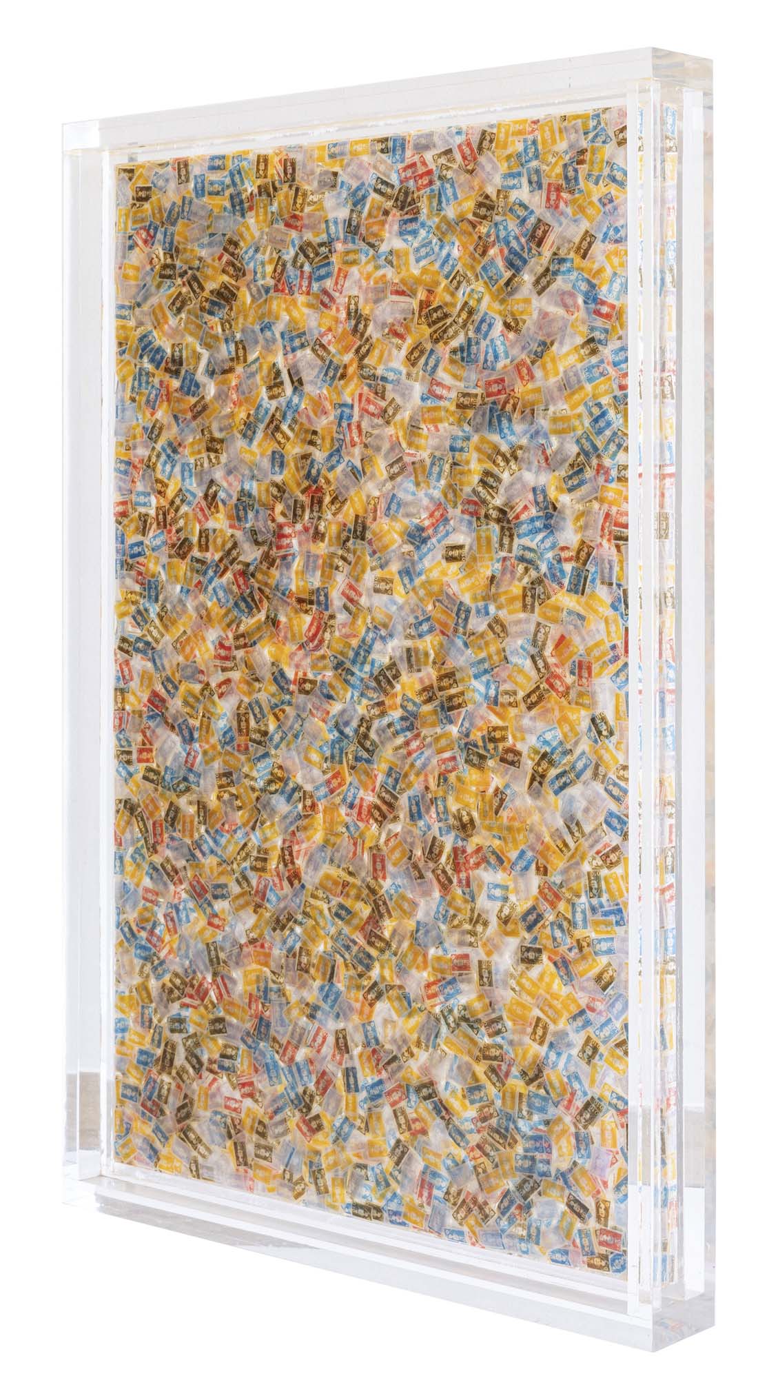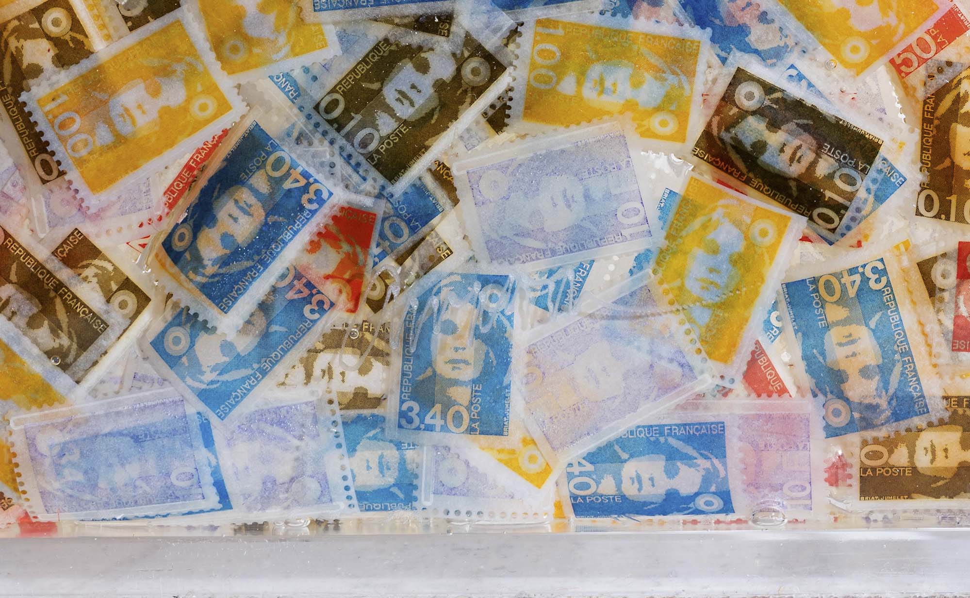 inclusione di timbri postali in resina entro teca plexiglass cm. 105x89x8