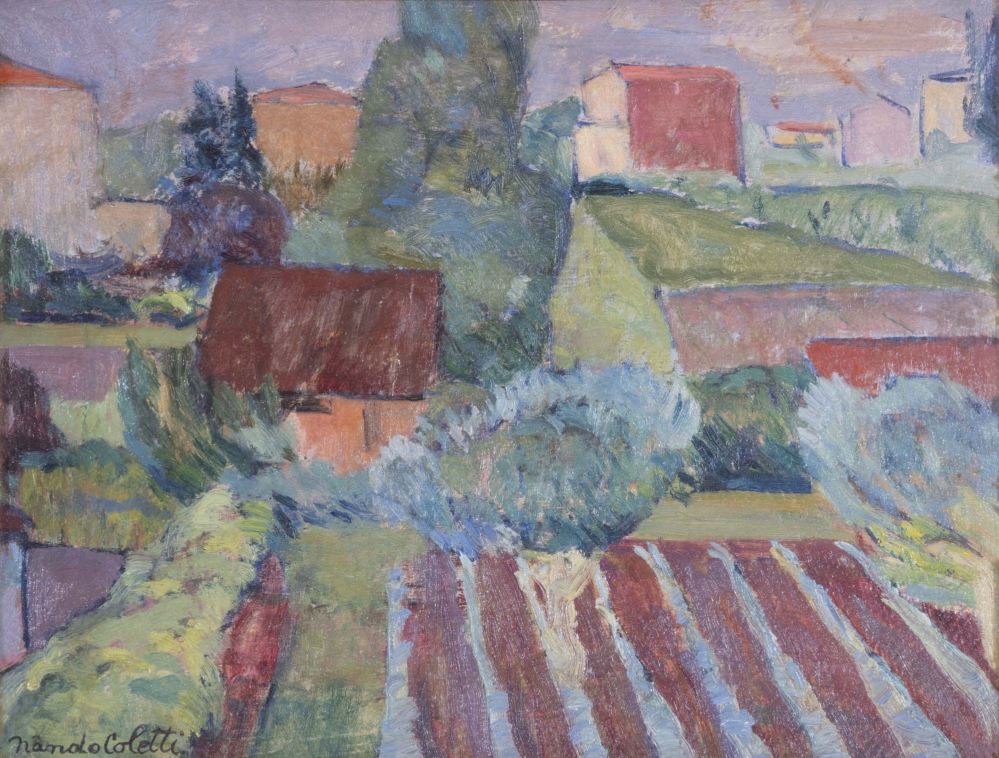 NANDO COLETTI (Treviso, 1907 - 1979) Paesaggio 1948 olio su cartone cm. 35x45...