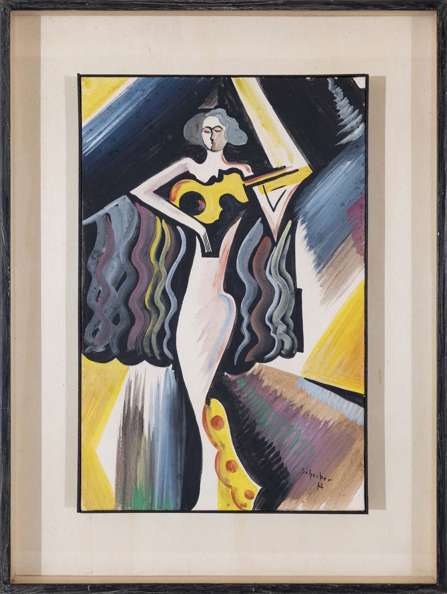 HUGO' SCHEIBER (Budapest, 1873 - 1950) Donna con chitarra tecnica mista su...