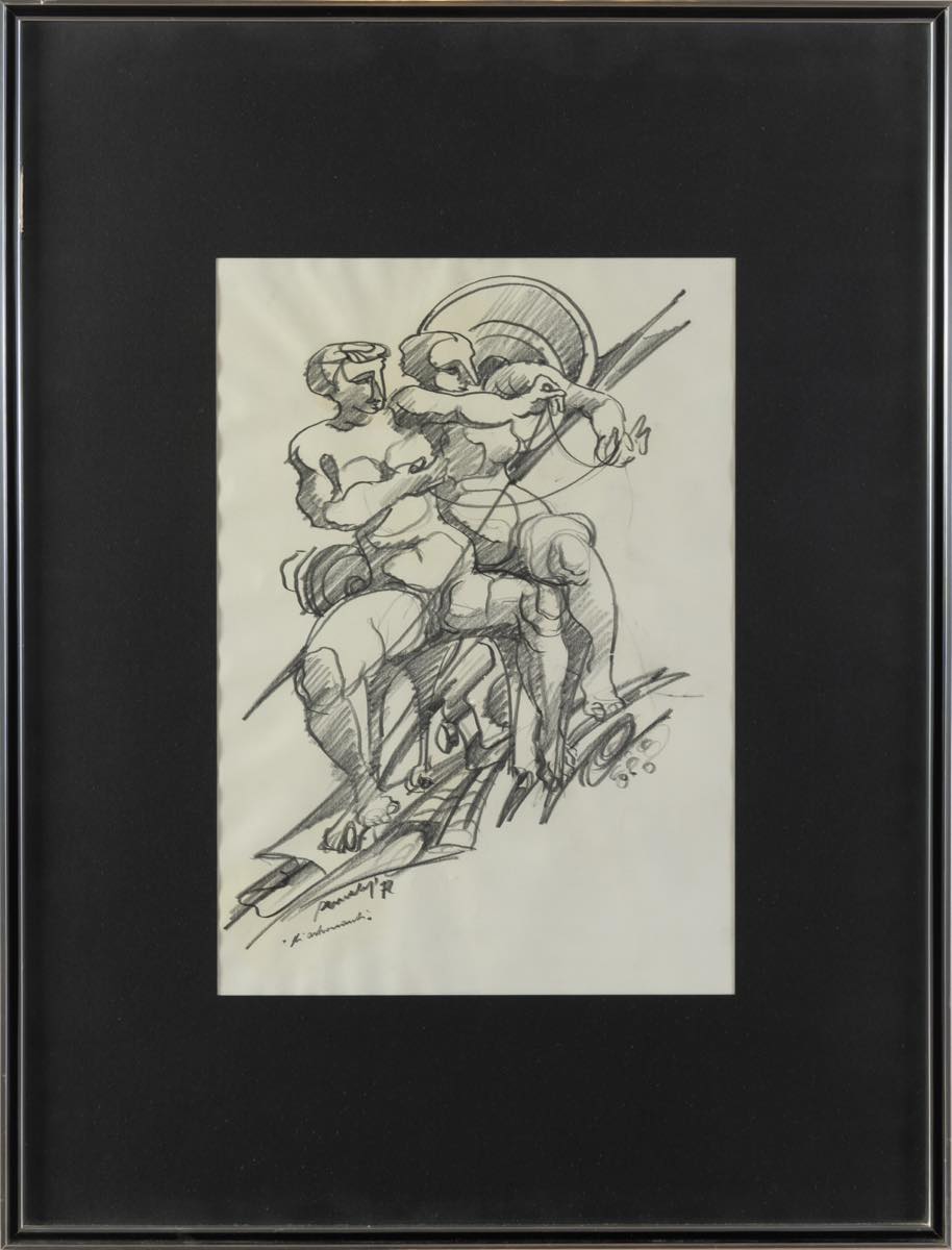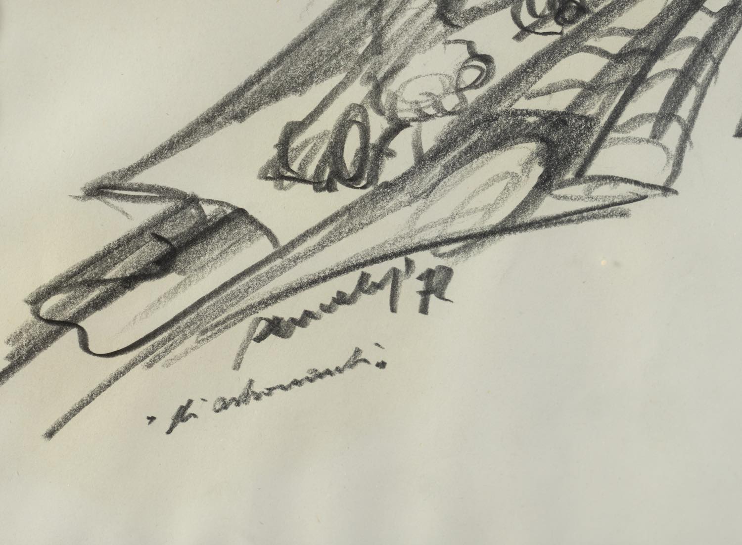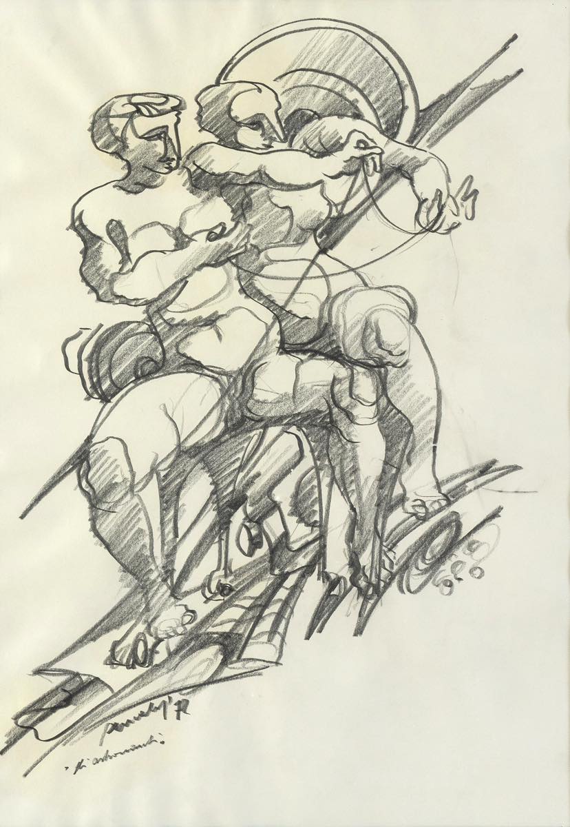 Leone Pancaldi (Bologna 1915 – 1995), “Gli astronatuti”, 1972. Carboncino su carta, reca in basso a sinistra firma, data e titolo, H cm 48x34