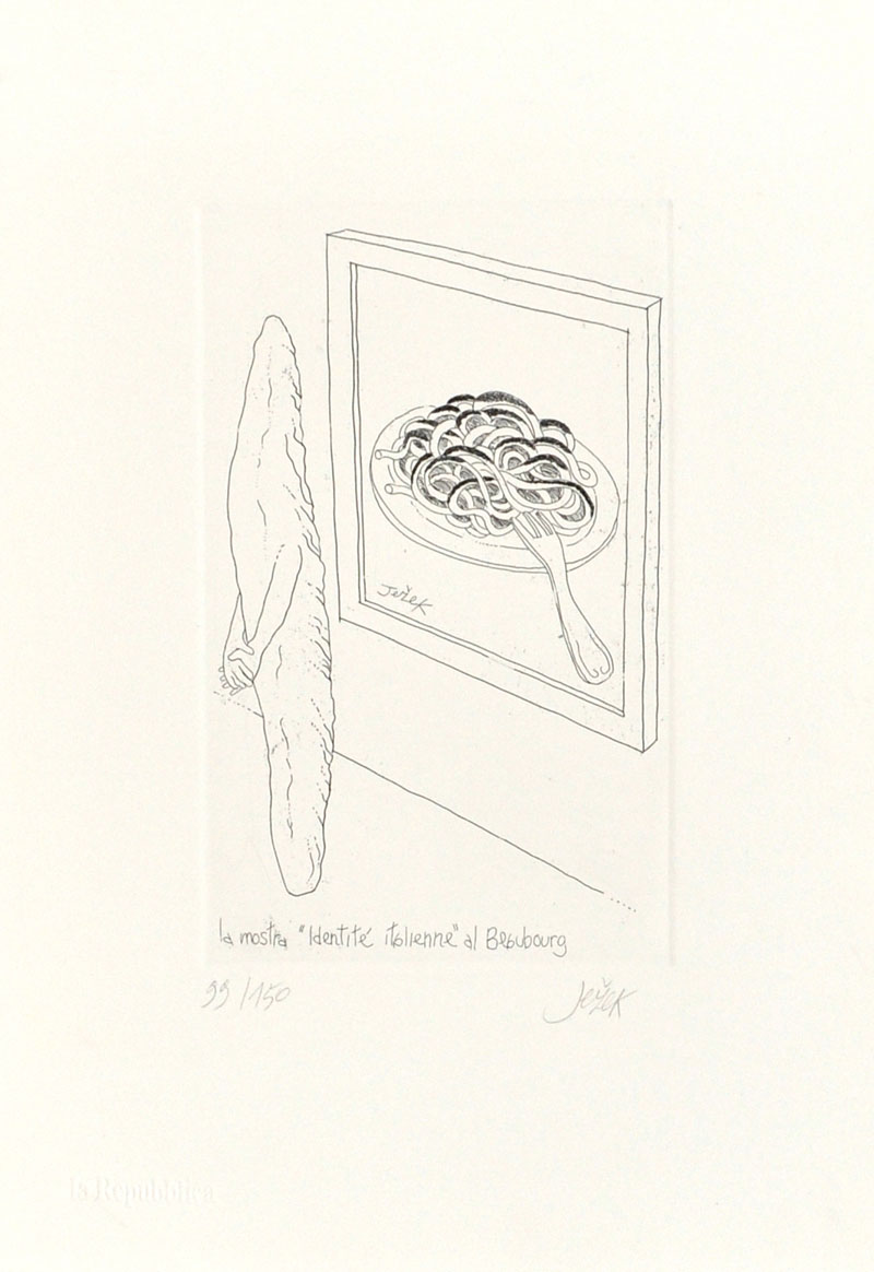 MOJMIR JEZEK La mostra “Identité italienne” al Beaubourg Acquaforte in b/n – es. 99/150 cm. 35,5x25 Firma, tiratura e titolo in basso Dalla cartella “La Repubblica”, Grafici fuori dal quotidiano