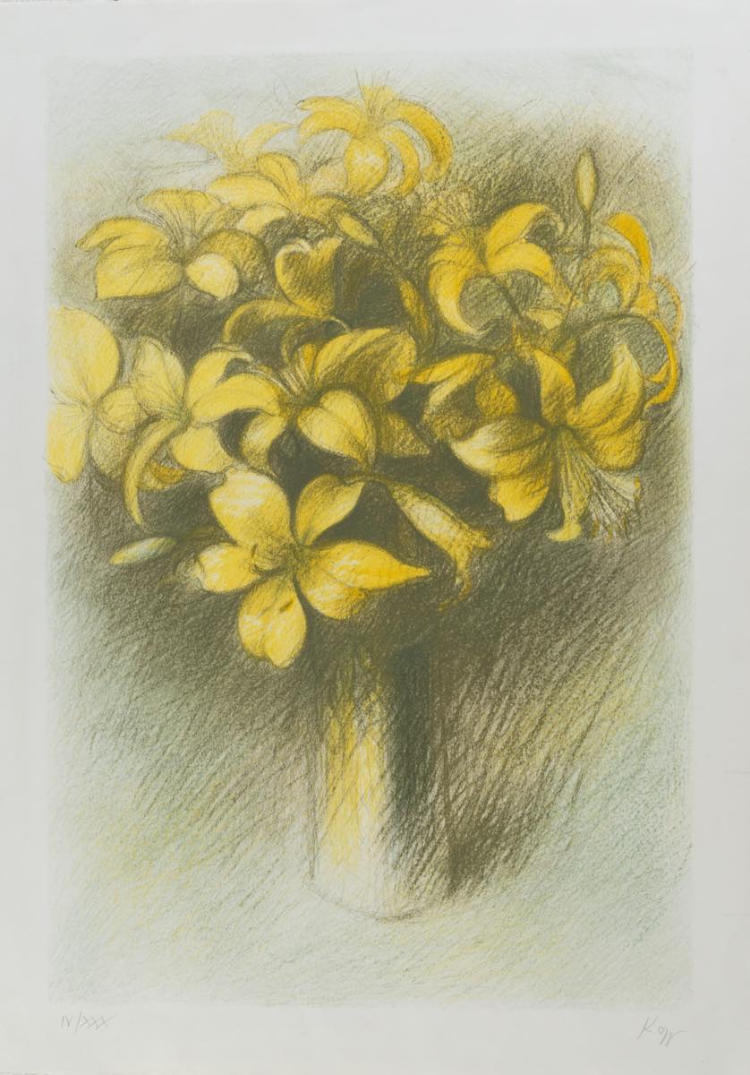 Dieter Kopp (Prien am Chiemsee 1939 - Ardea 2022), “Vaso di gigli”. Litografia a colori su carta, firmata in basso a destra, numero di tiratura in basso a sinistra IV/XXX, Foglio H cm 69.5x49.5