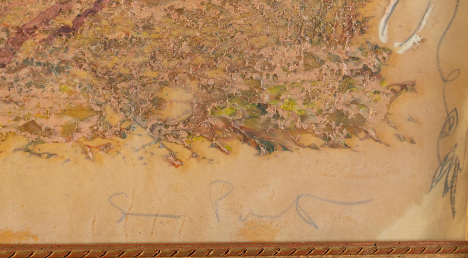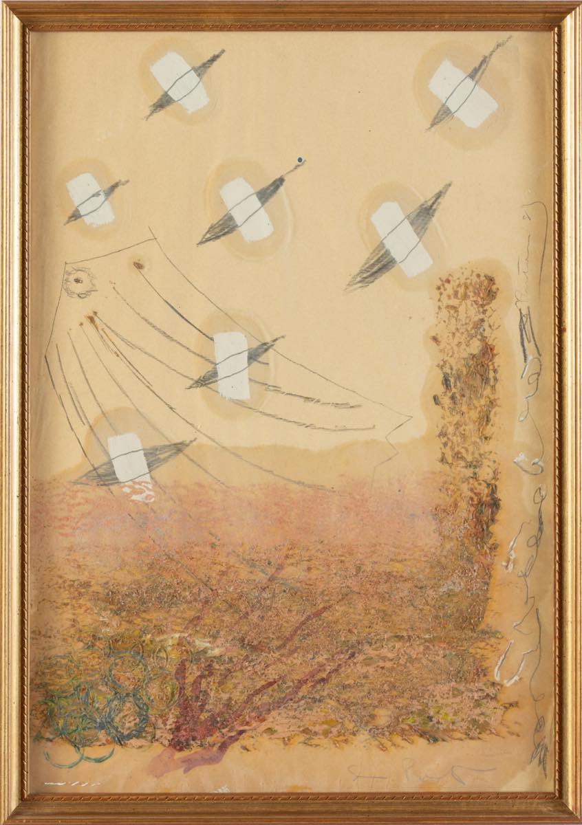 Giovanni Pintori (Tresnuraghes 1912 – Milano 1999), “Senza titolo”, 1989. Tecnica mista su carta, firmata e datata sul lato destro al centro, reca al retro dedica, H cm 48x33 (lievi difetti)
