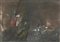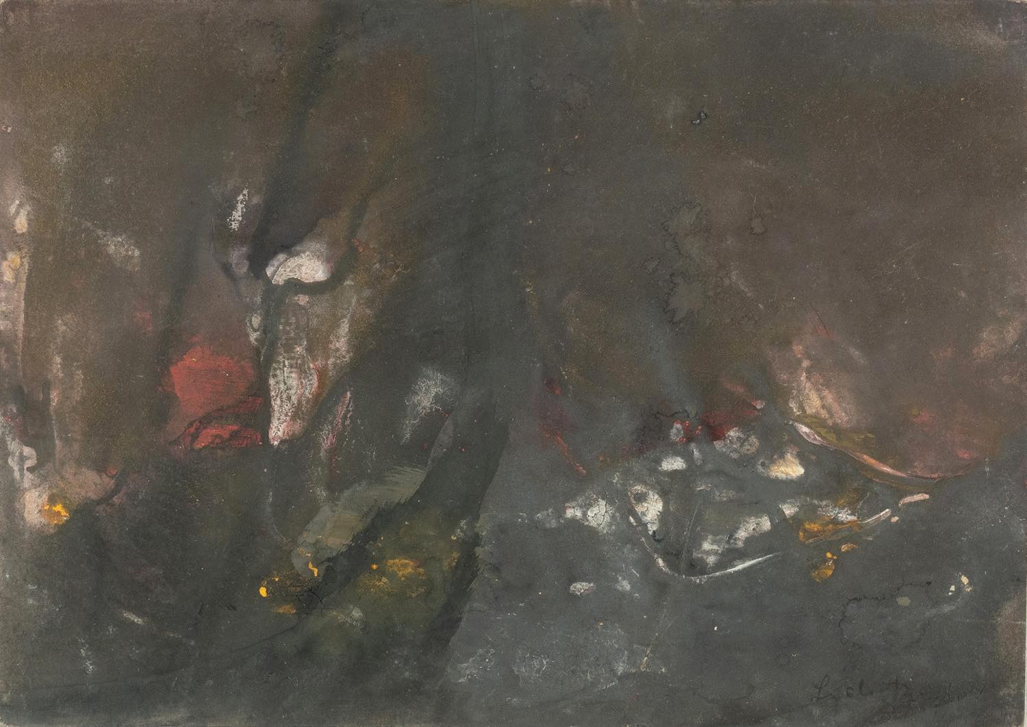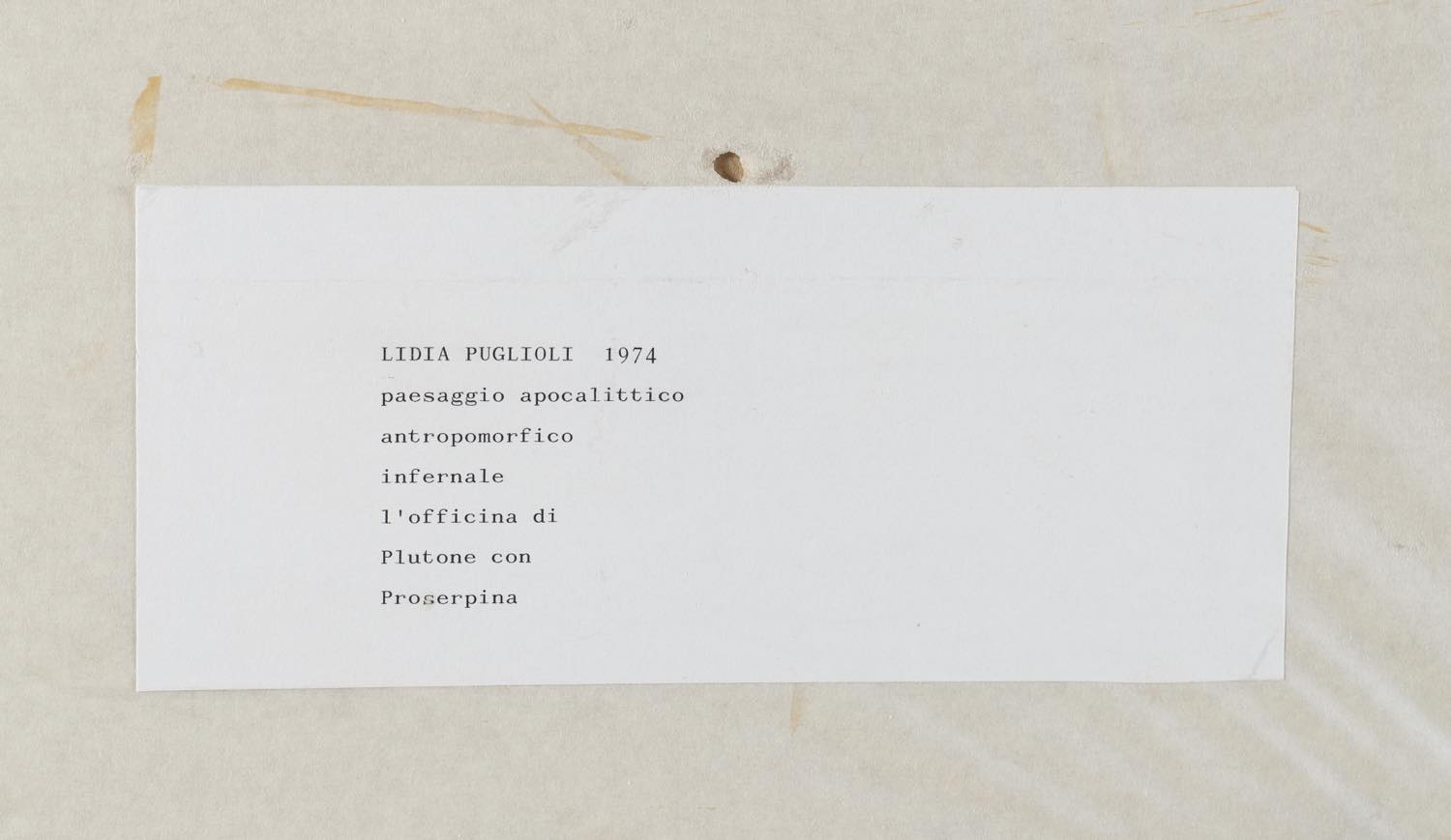 Lidia Puglioli (S. Lazzaro di Savena 1919 - Bologna 2013), “Paesaggio apocalittico antropomorfico infernale”, 1974. Tecnica mista su cartoncino, firmata e datata in basso a destra, reca al retro etichetta con autore, data e titolo, H cm 24.5x34.5