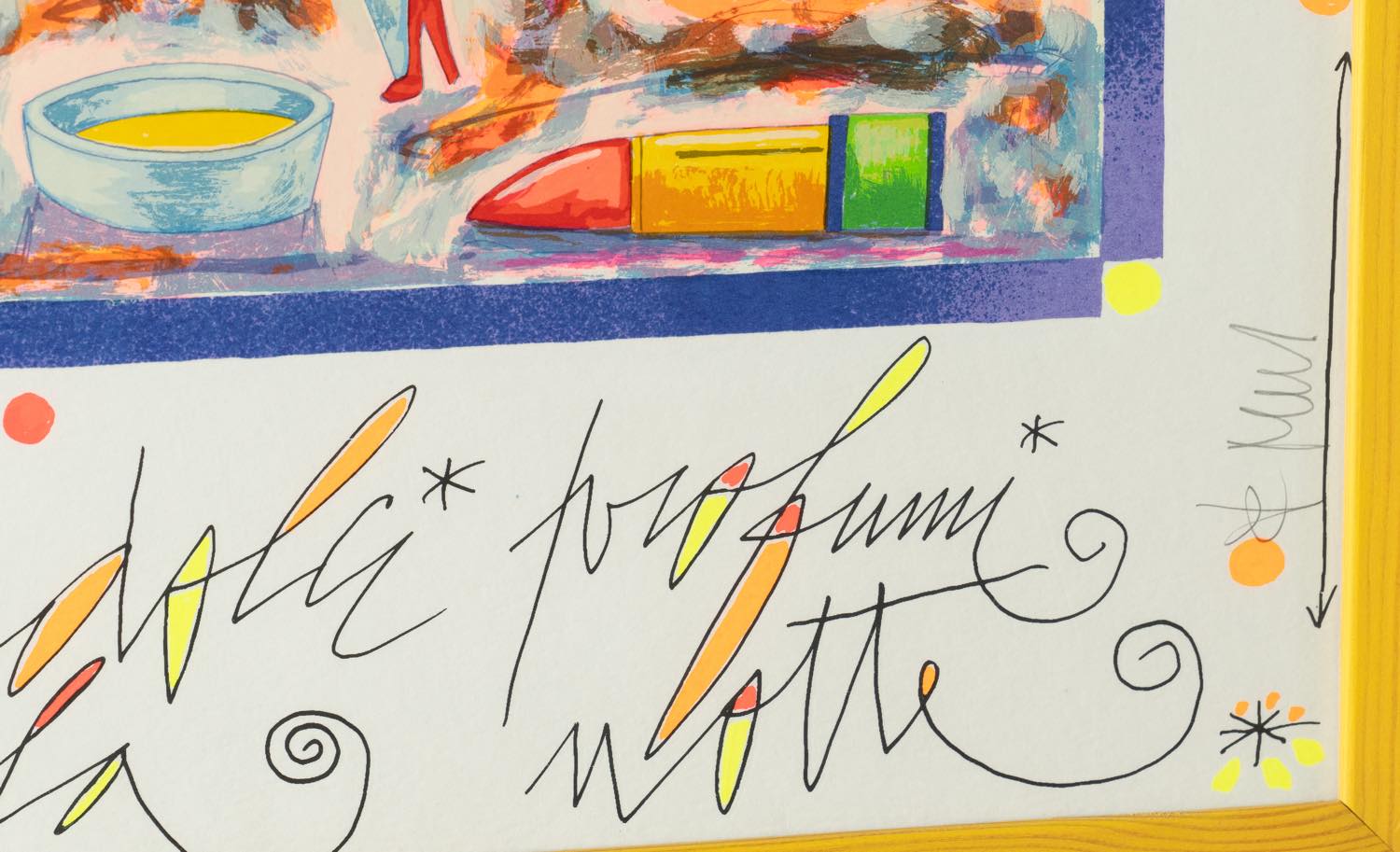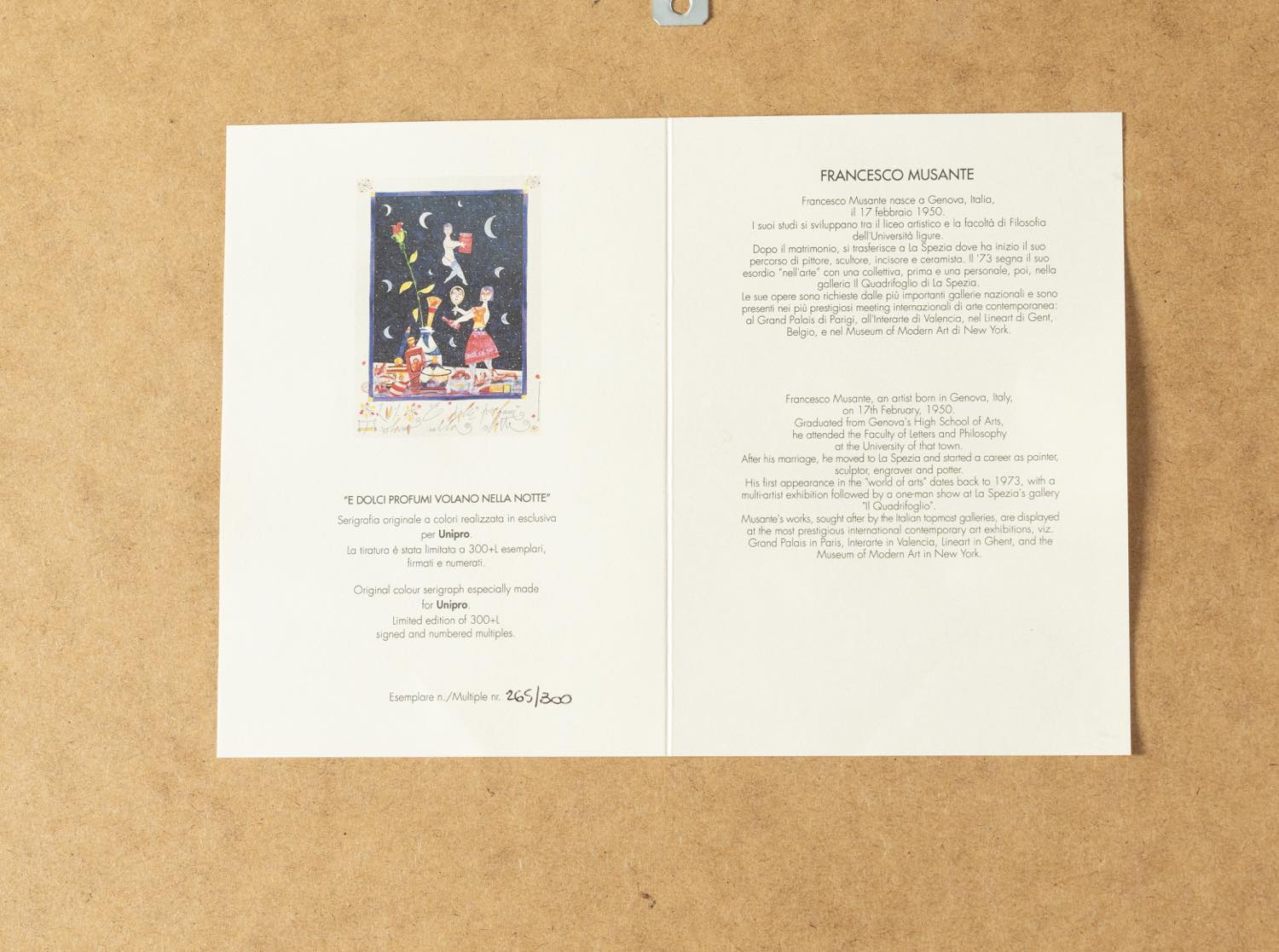 Francesco Musante (Genova 1950), “E dolci profumi volano nella notte”. Serigrafia a colori su carta, reca titolo e firma in basso al centro, numero di tiratura in basso a sinistra 265/300, reca al retro certificato di autenticità, H cm 70x50