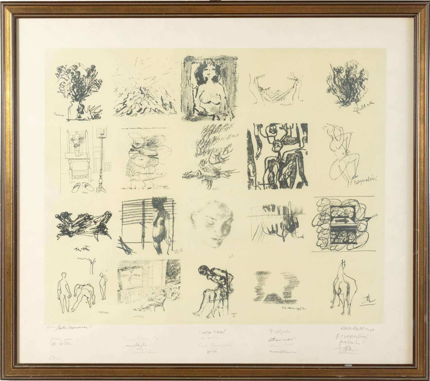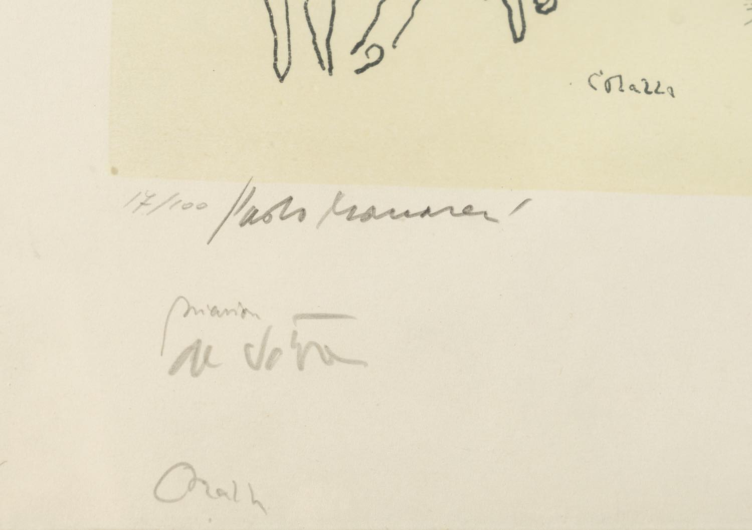 Artisti Vari (XX secolo), “Senza titolo”. Litografia su carta, reca in basso a sinistra numero di tiratura 17/100, in basso firme di Paolo Manaresi, Biasion, De Vita, Corazza / Pirro Cuniberti, Mattioli, Carlo Leoni / Carlo Corsi, Vasco Bendini, Giov. Romagnoli, Boschi / F. Vignoli, Pancaldi, Ilario Rossi/ Colliva, Pasqualini, Tomba, H cm 68x88.5