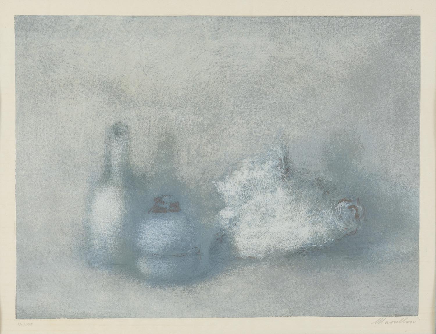 Norma Mascellani (Bologna 1909 – 2009), “Natura morta con conchiglia”. Litografia su carta, firmata in basso a destra, numero di tiratura in basso a sinistra 14/100, Lastra H cm 30x40