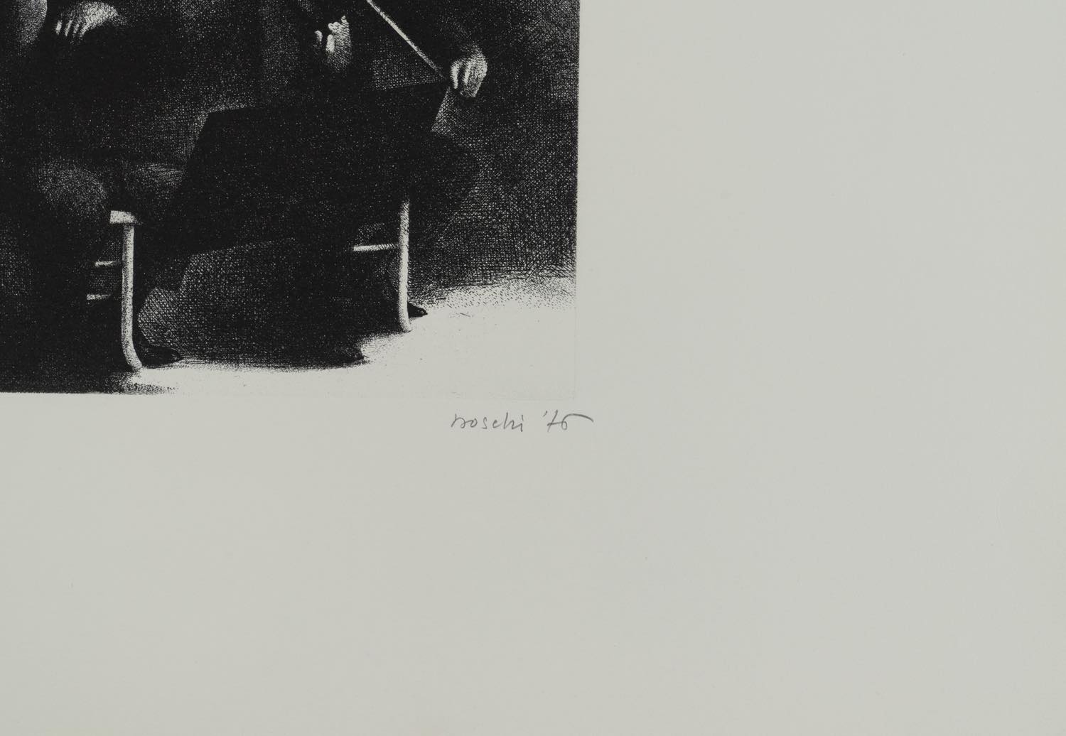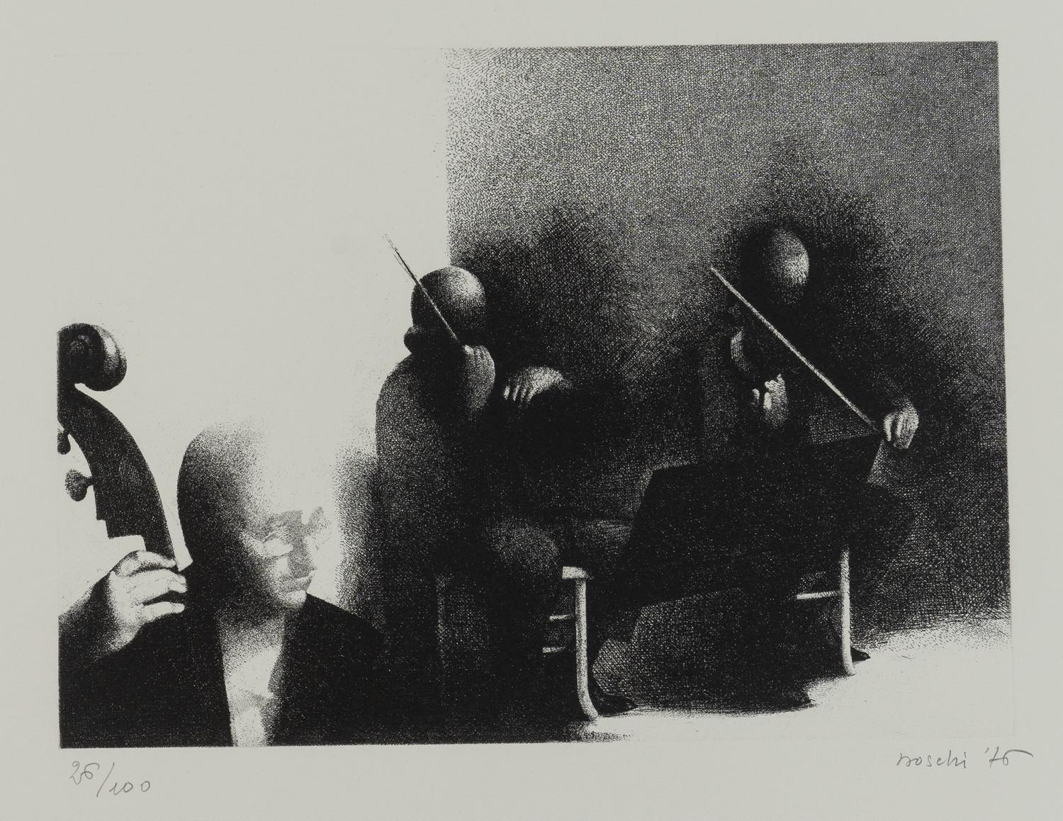 Dino Boschi (Bologna 1923 – 2015), “Il concerto”, 1976. Acquaforte su carta, firmata e datata in basso a destra, numero di tiratura in basso a sinistra 26/100, Lastra H cm 24.5x35