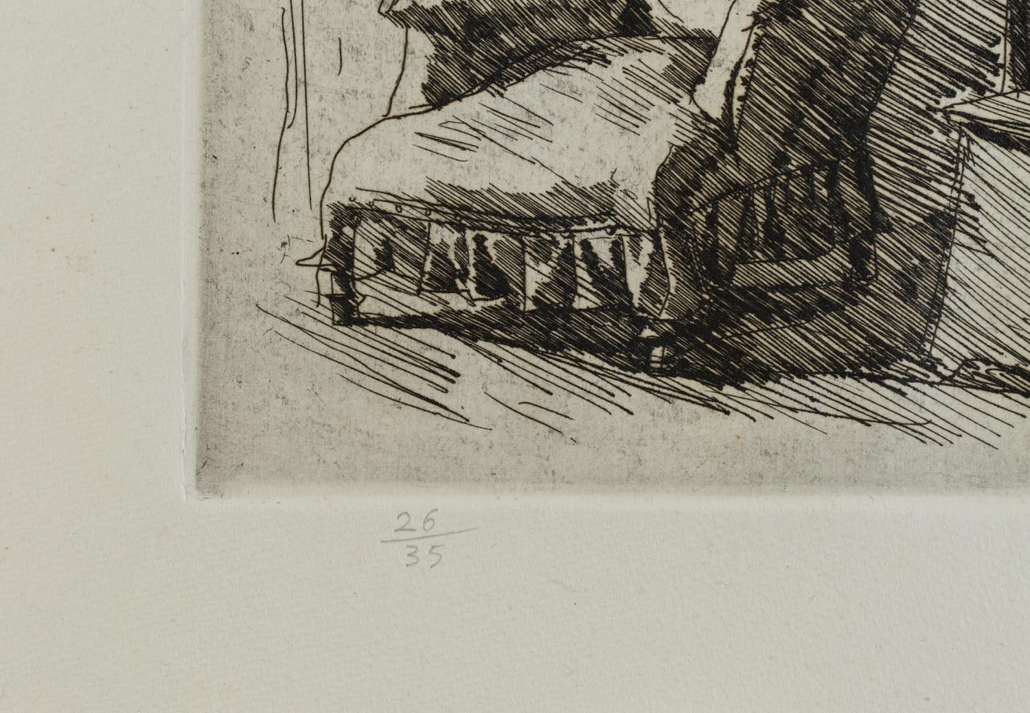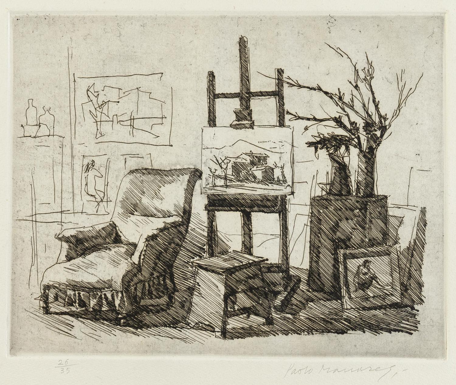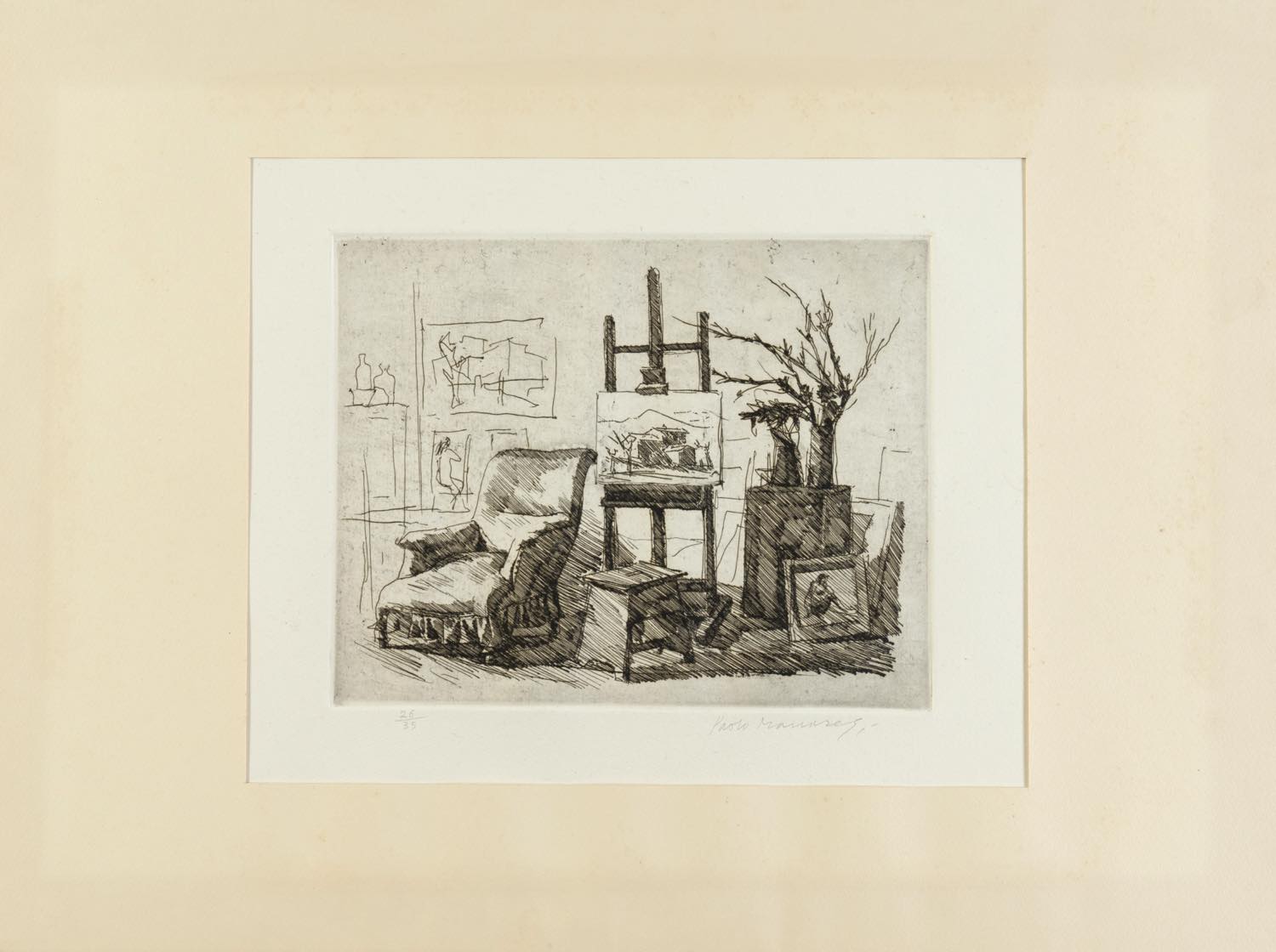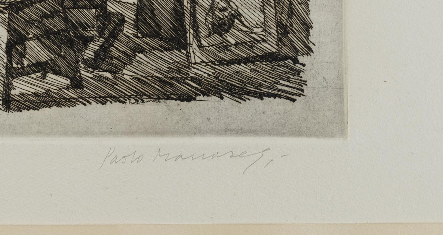 Paolo Manaresi (Bologna 1908 - 1991), “Scena d’interno”. Acquaforte su carta, firmata in basso a destra, numero di tiratura in basso a sinistra 26/35, Lastra H cm 22x27.5