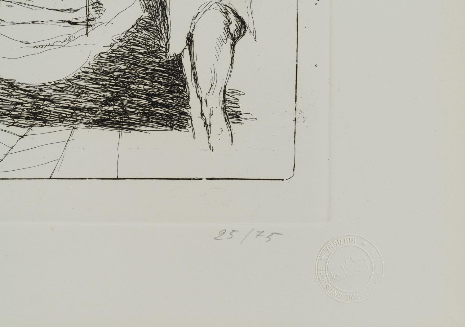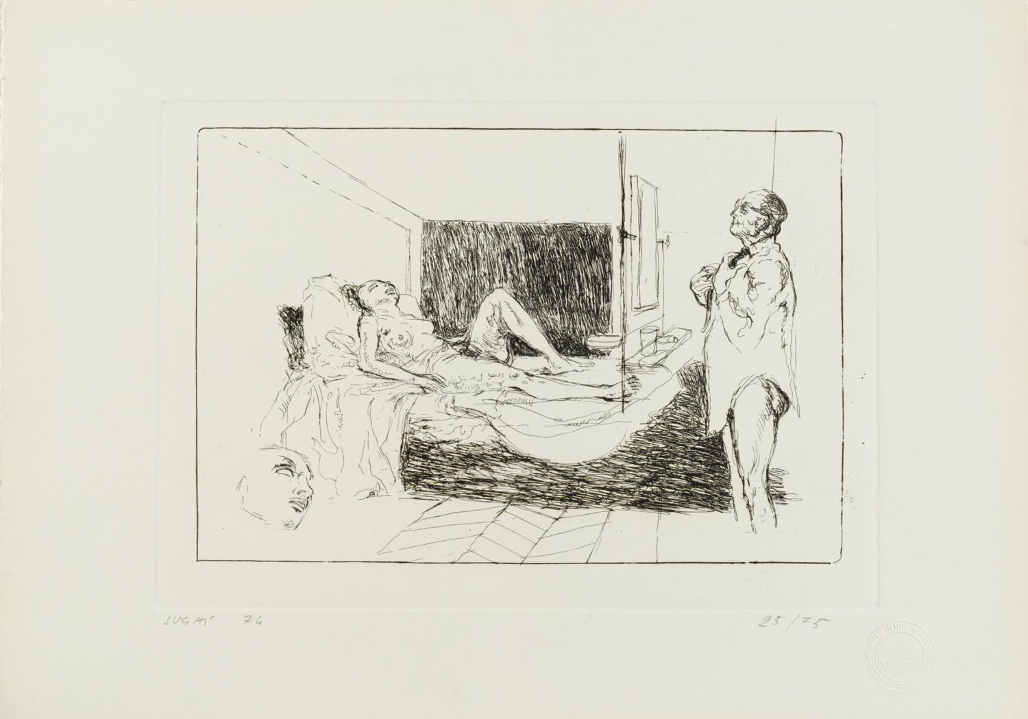 Alberto Sughi (Cesena 1928 - Bologna 2012), “Senza titolo”, 1974. Acquaforte su carta, firmata e datata in basso a sinistra, numero di tiratura in basso a destra 25/75, reca timbro a secco “Nuove Prospettive Artistiche Bologna”, Lastra H cm 24.5x34.5 (difetto)