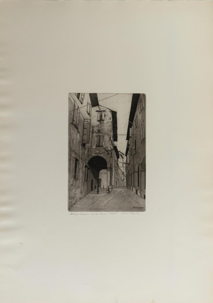 Carlo Caporale (San Giovanni in Persiceto 1923 - San Benedetto in Val di Sambro 2000), “Bologna vecchia: via De Chiari”. Acquaforte su carta, firmata in basso a destra, reca titolo in basso a sinistra e numero di tiratura in basso al centro 62/100, Lastra H cm 28x18 Provenienza: Galleria Forni - Bologna