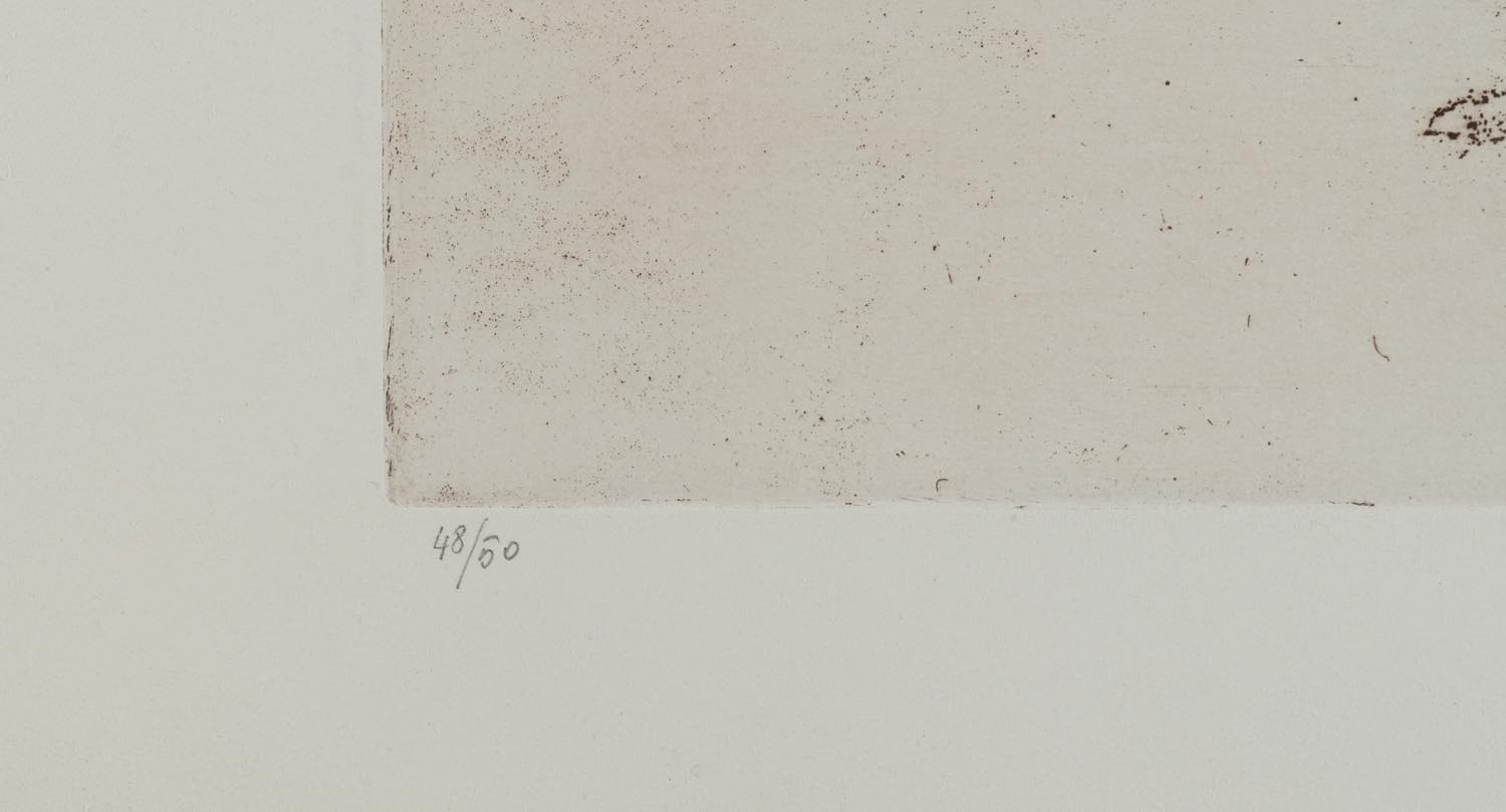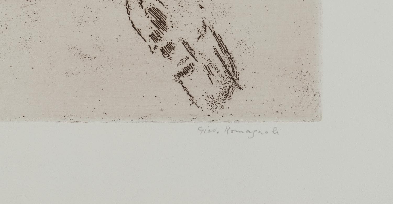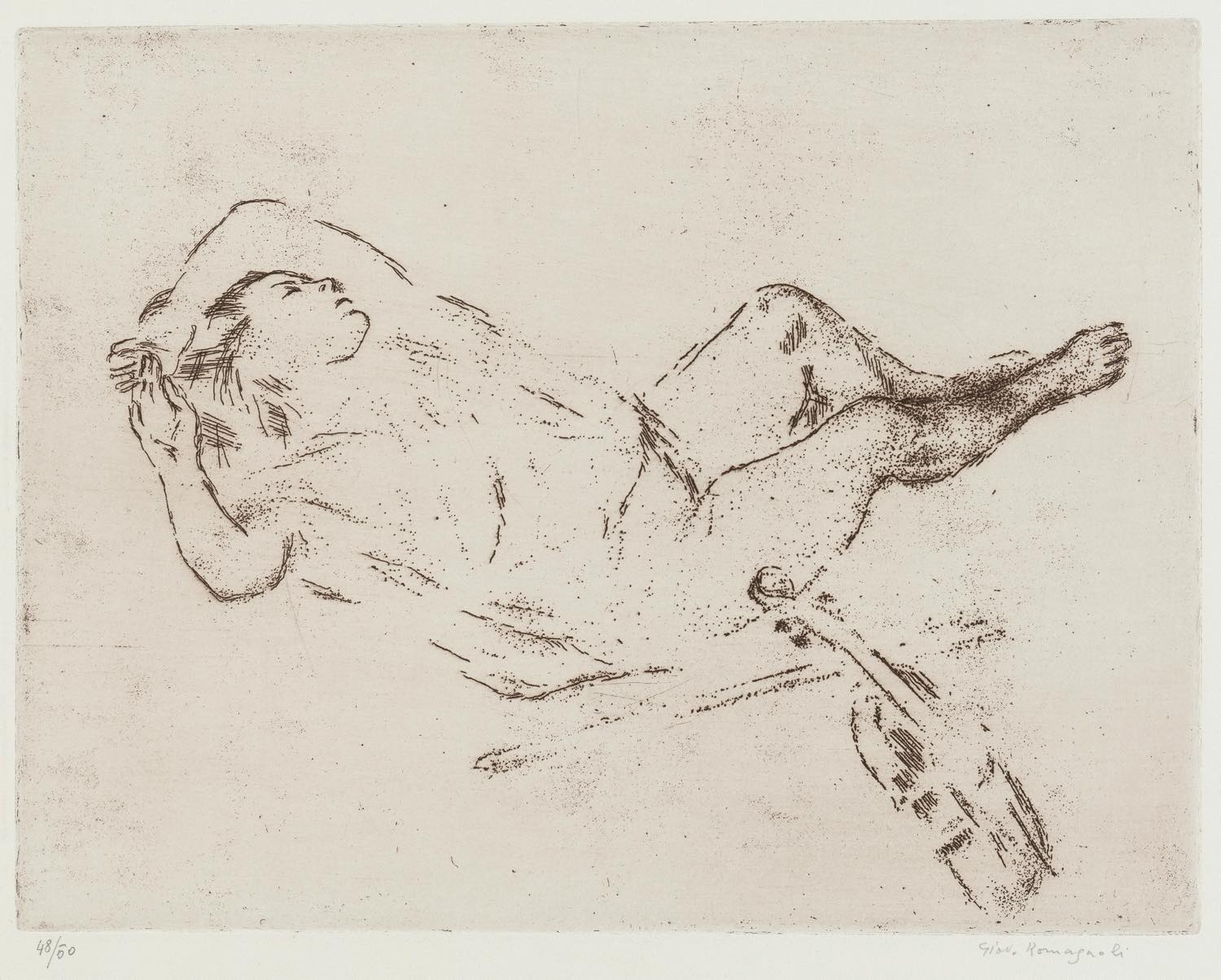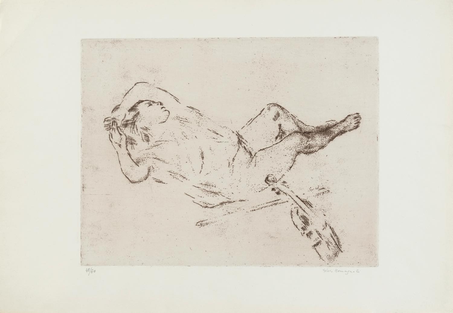 Giovanni Romagnoli (Faenza 1893 – Bologna 1976), “Nudo addormentato con violino”. Acquaforte su carta, firmata in basso a destra, numero di tiratura in basso a sinistra 48/50, Lastra H cm 25x32