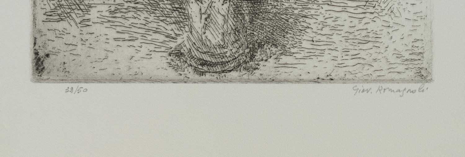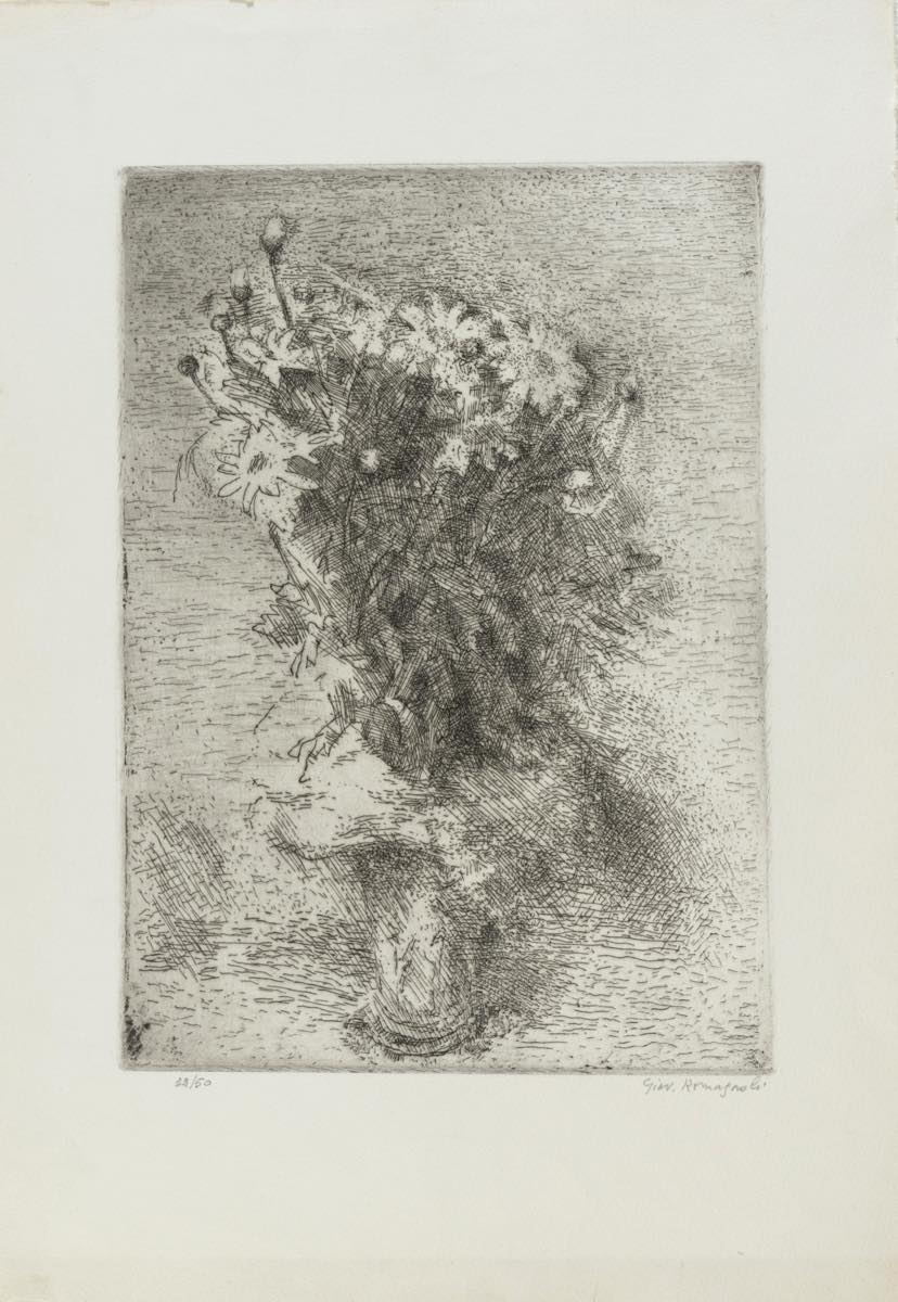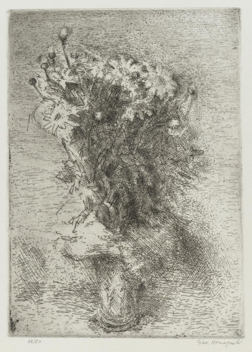 Giovanni Romagnoli (Faenza 1893 – Bologna 1976), “Margherite”. Acquaforte su carta, firmata in basso a destra, numero di tiratura in basso a sinistra 32/50, Lastra H cm 35x25