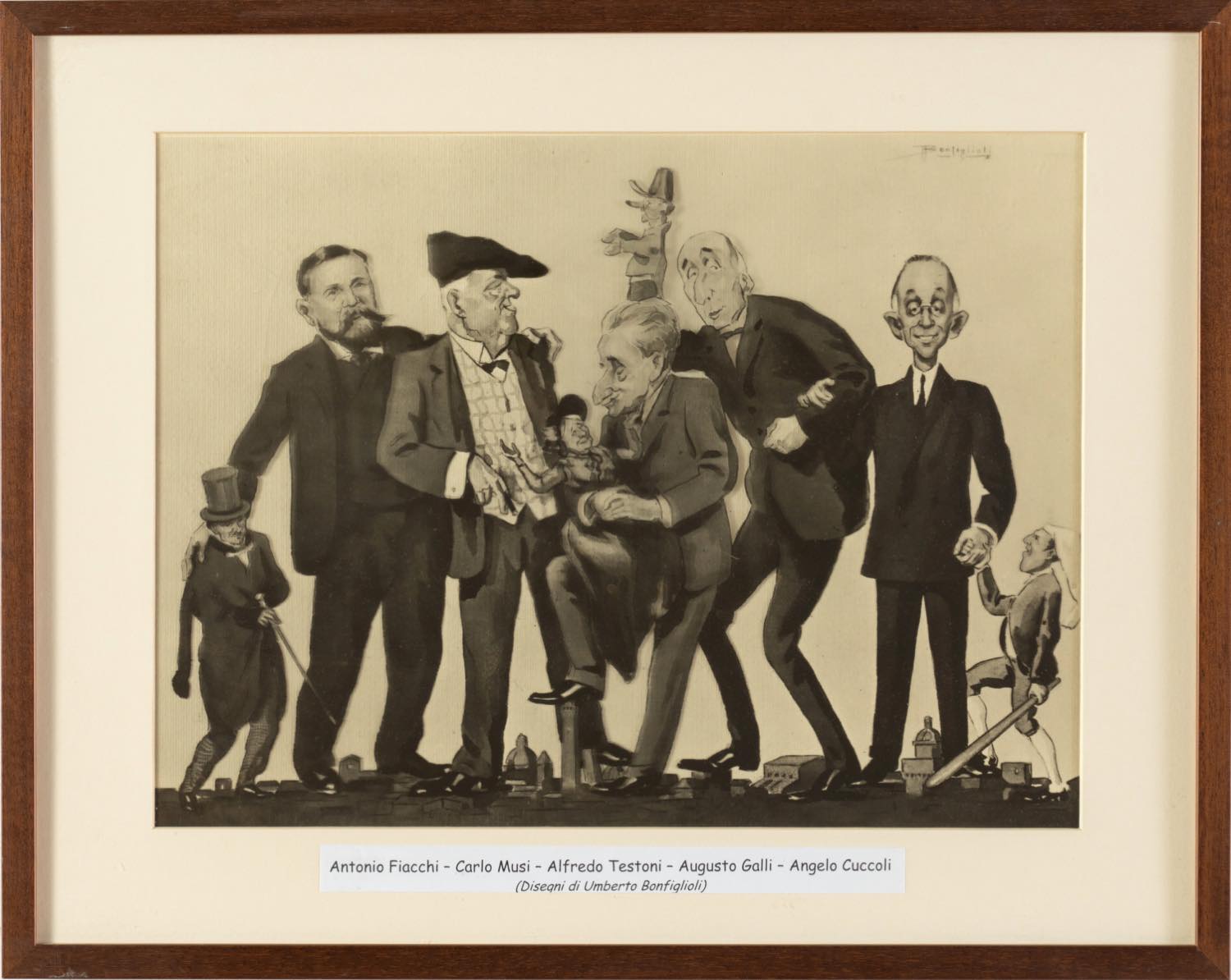 Umberto Bonfiglioli (Bologna 1892 - 1974), “Antonio Fiacchi – Carlo Musi – Alfredo Testoni – Augusto Galli – Angelo Cuccoli”.