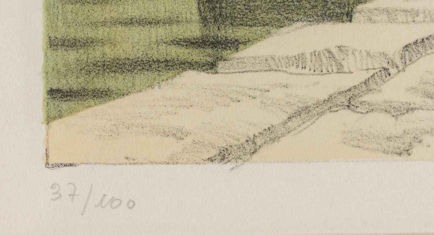 Romano Parmeggiani (Venezia 1930 – Santoro 2002), “Senza titolo”. Litografia a colori su carta, firmata in basso a destra, numero di tiratura in basso a sinistra 37/100, Foglio H cm 56x71